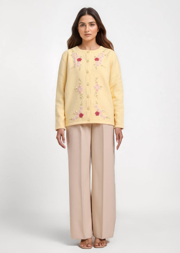L-Yellow-Round Neck Full Sleeves Cardigan Sweater (25Y-031-67)