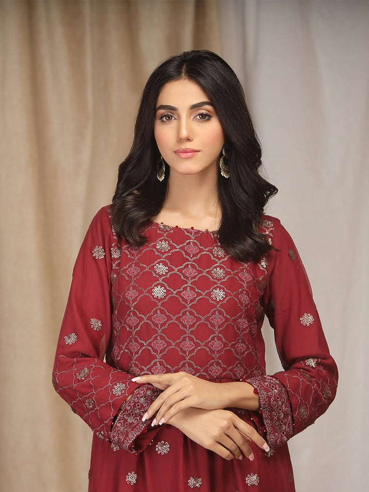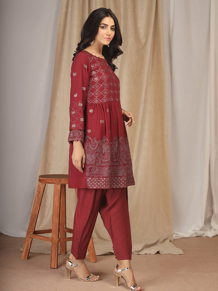 A 2 pc article having short flared shirt with embroidered front and sleeves. It's paired with shalwar having loop button details.