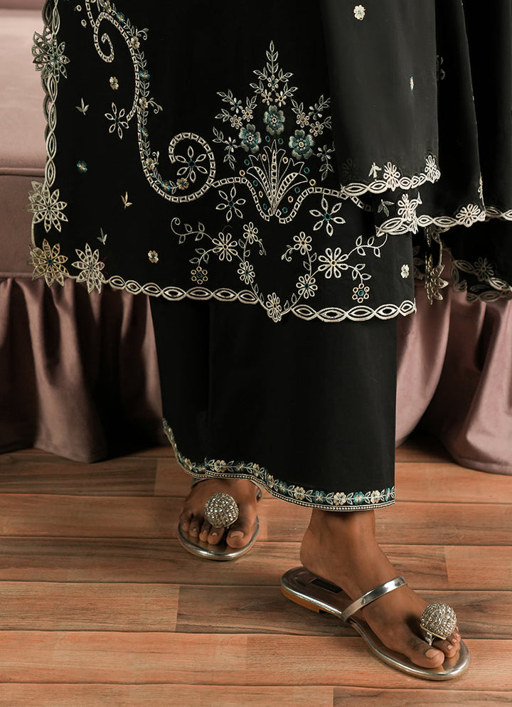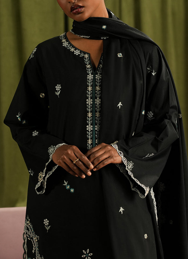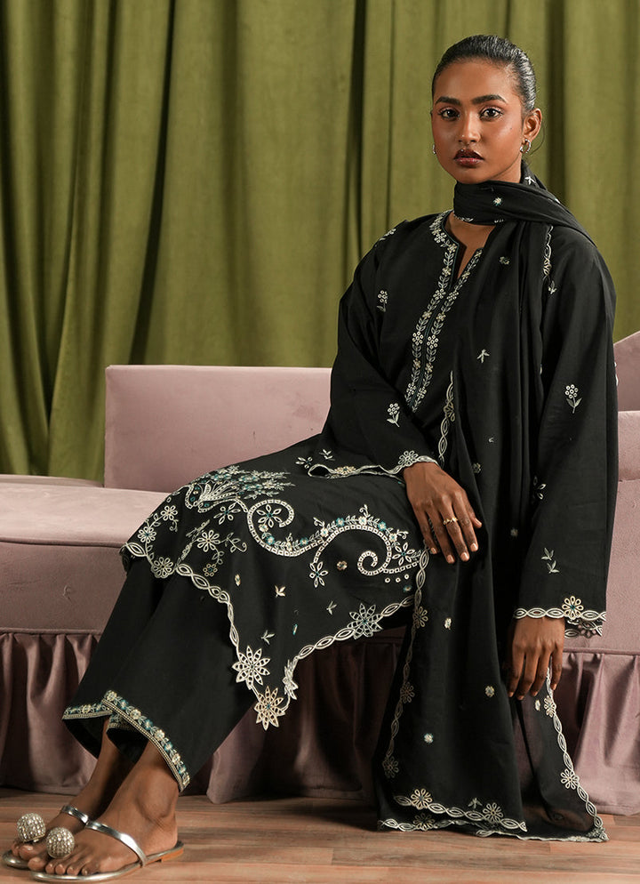 The Black Cotton Embroidered 3-Piece Suit from our Spring The Tea '25 Collection features a straight silhouette, round neckline with a slit, full length embroidered sleeves, paired with embroidered izaar & dupatta.