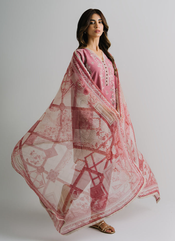 The Coral Pink 3 PC Cotton Embroidered Suit from our Image Signature category features V neckline & full-length bell sleeves paired with a shalwar & chiffon dupatta.