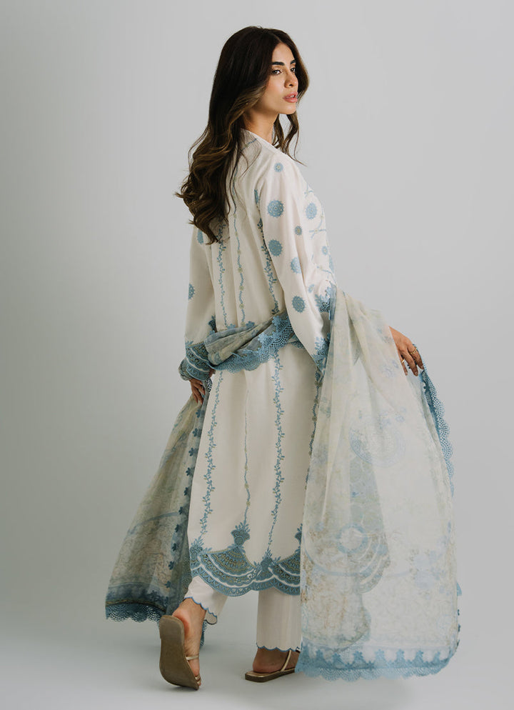 The Ivory 3 PC Cotton Embroidered Suit from our Image Signature category features band collar & full-length bell sleeves paired with trousers & chiffon dupatta.