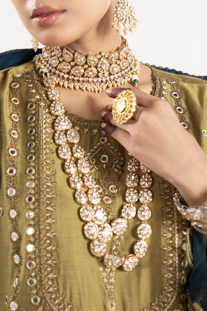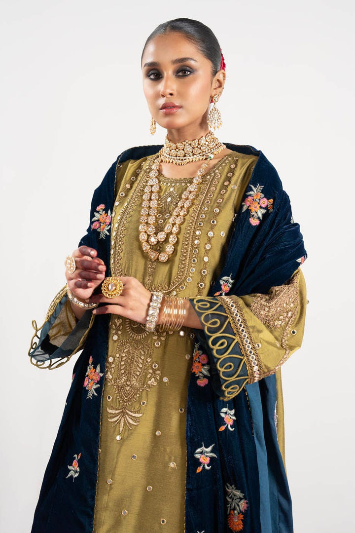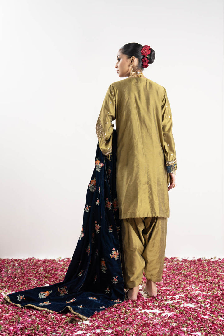 Embroidered Yarn Dyed Silk Suit With Velvet Shawl