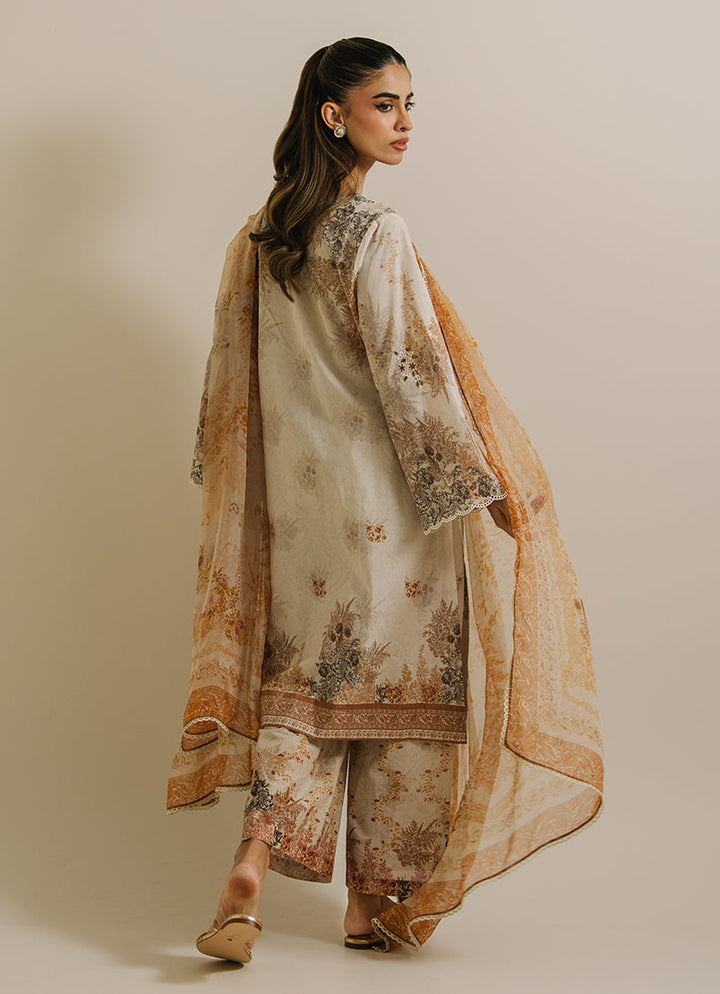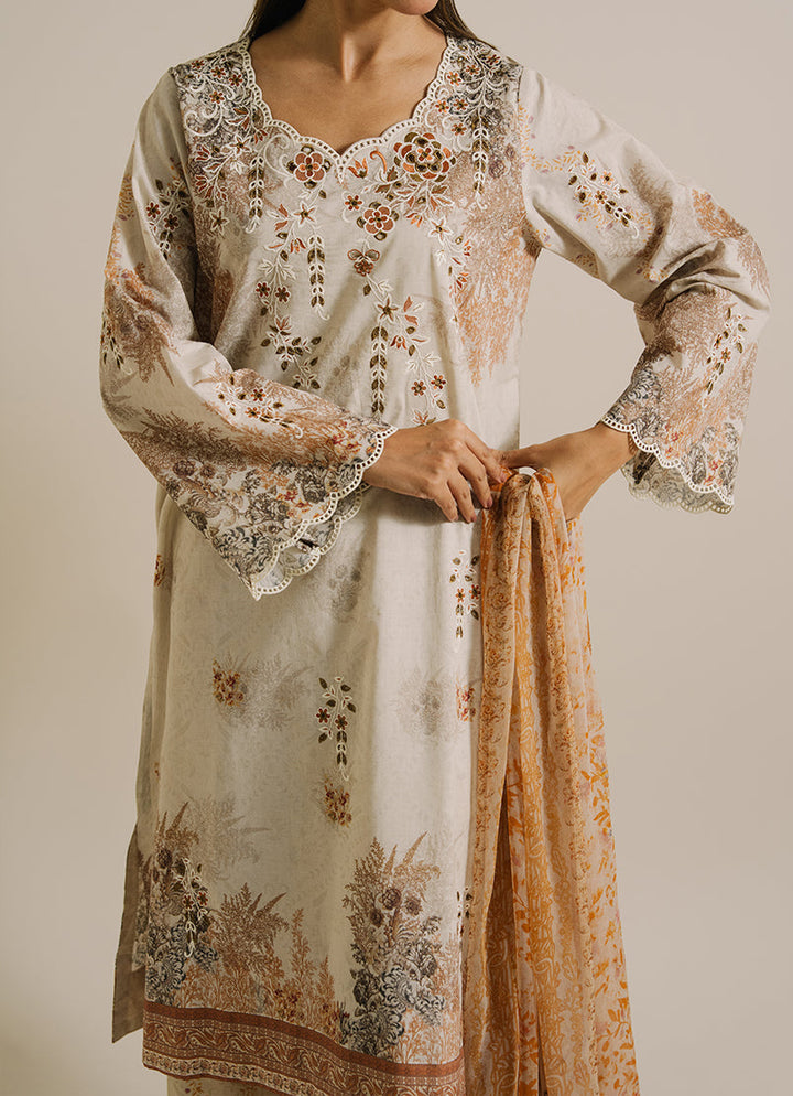 The Beige Cotton/Chiffon Embroidered 3pc Suit from our IM Print category features round neckline & full-length bell sleeves paired with straight trousers & dupatta.