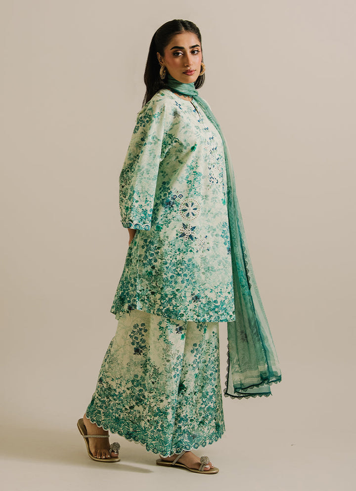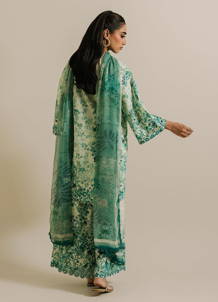 The Green Cotton/Chiffon Embroidered 3pc Suit from our IM Print category features round neckline with a slit & full-length bell sleeves paired with embroidered trousers & dupatta.