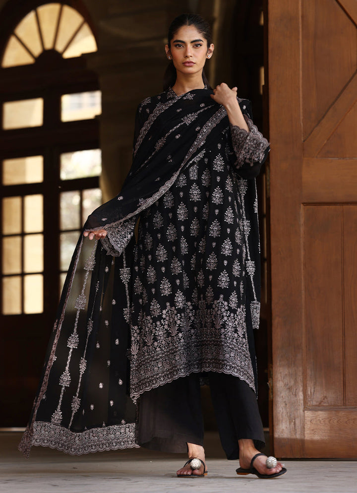 The Black Chiffon 3pc Embroidered Suit from Festive Collection '25. A straight silhouette, V neckline, full length embroidered sleeves paired with straight culottes and embroidered dupatta.