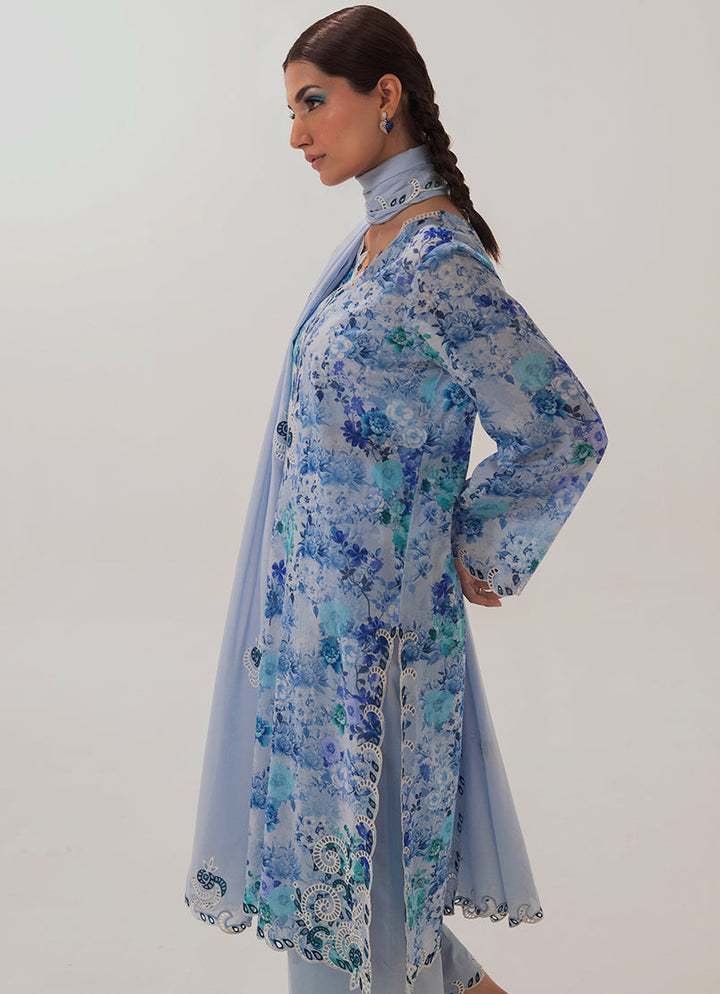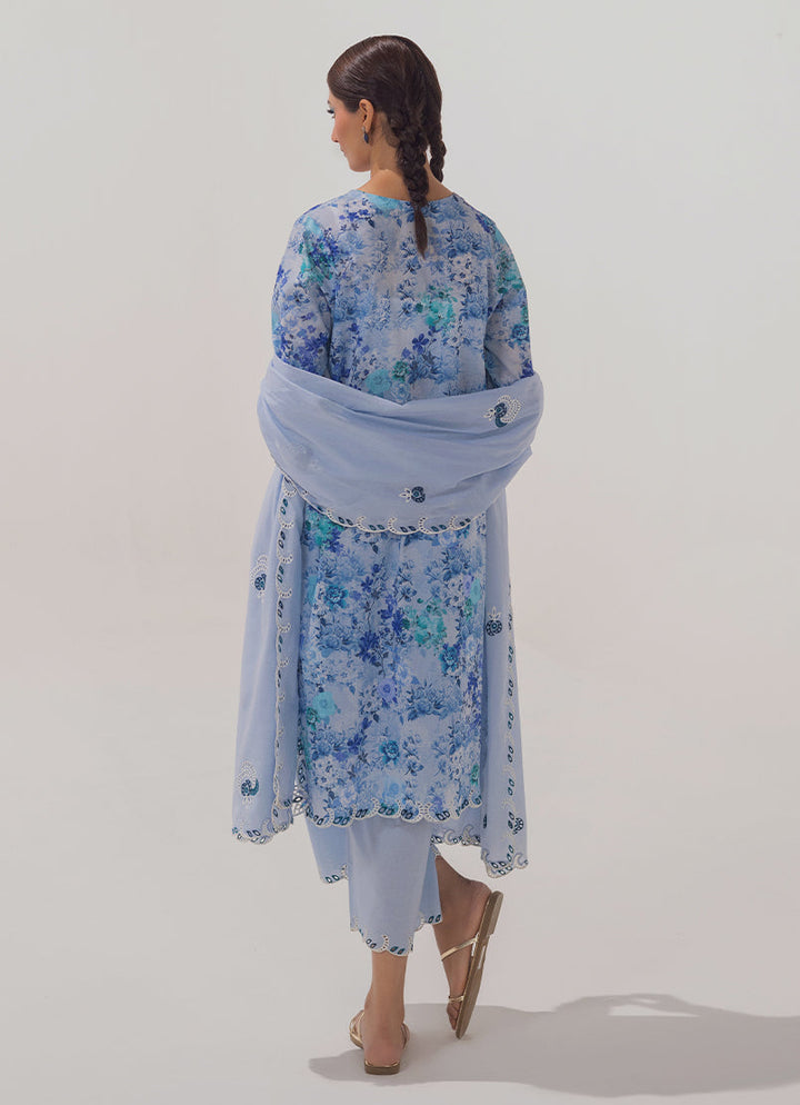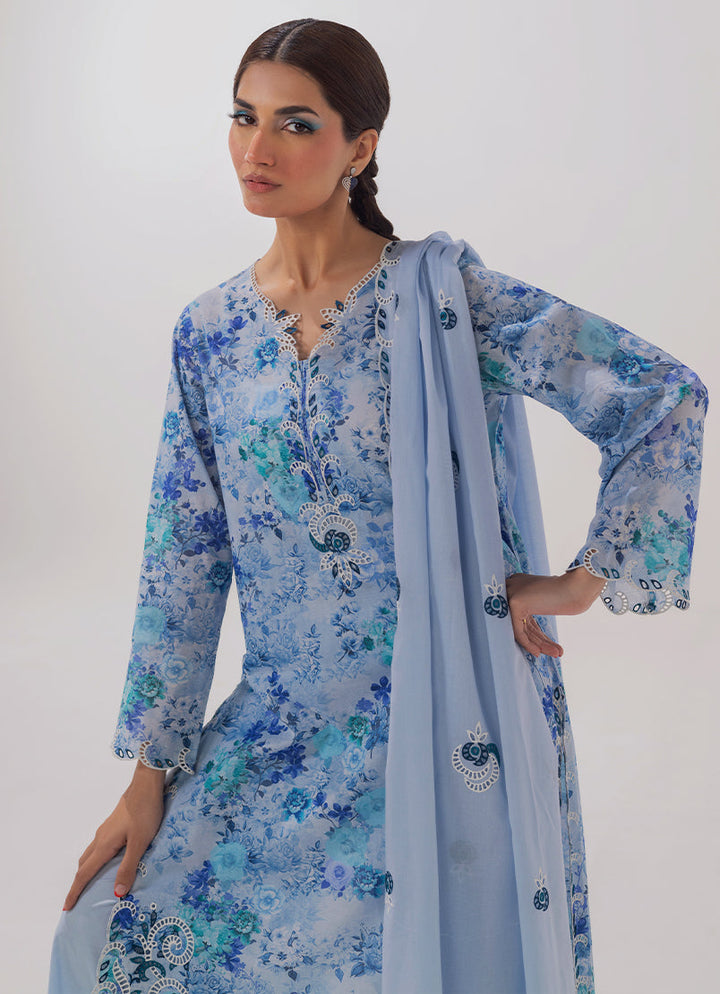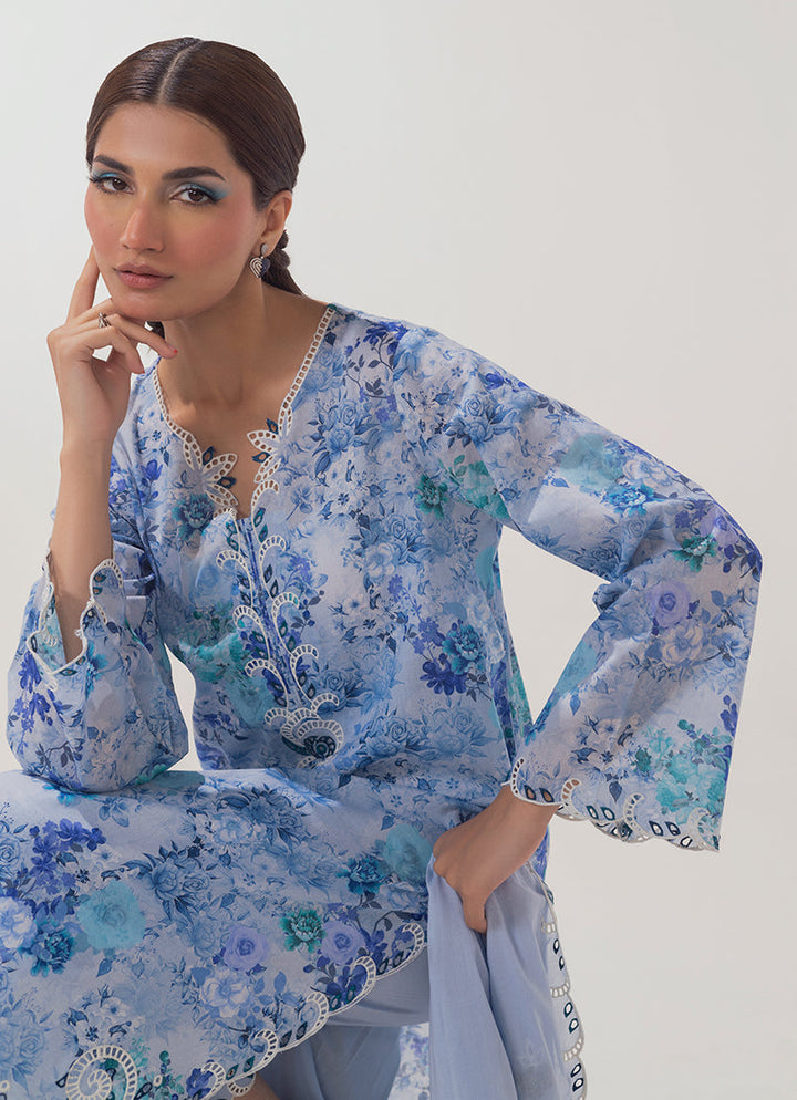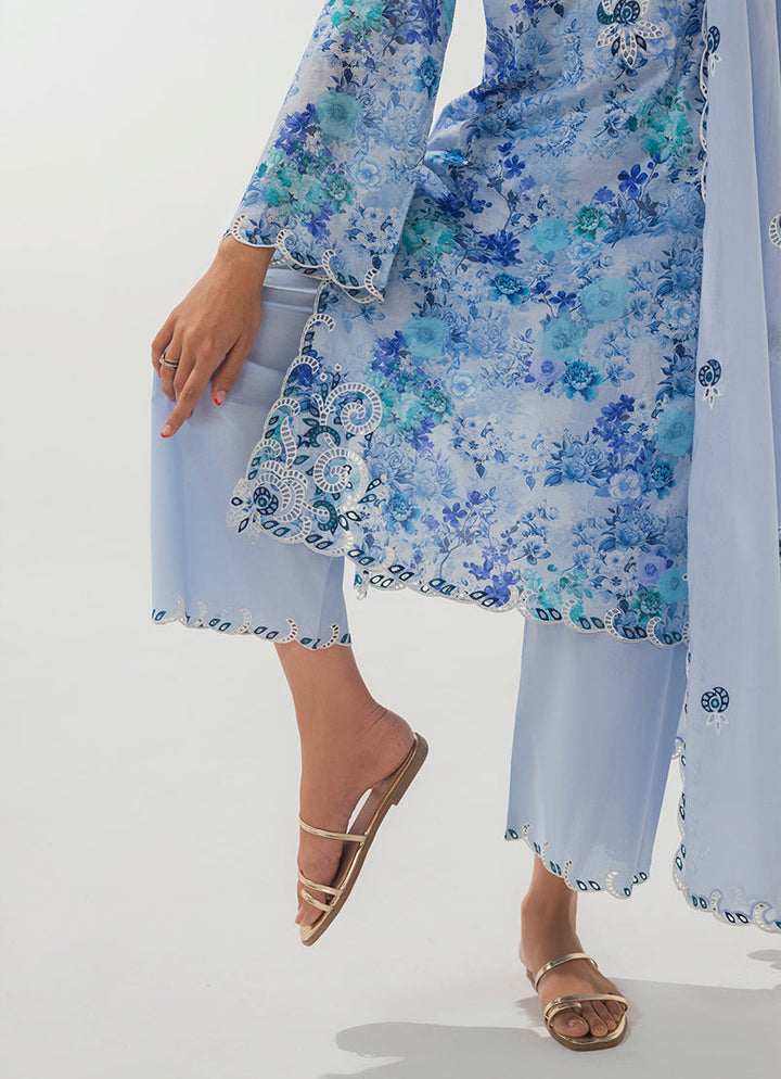 The Blue Cotton 3PC Embroidered outfit from our Spring basics '25 Collection features a printed shirt, paired with a cutwork embroidered trouser & dupatta.