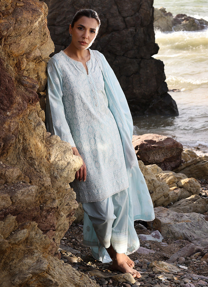 The Light Blue Cotton Embroidered 3pc Suit from the Spring Pret '25 collection features a round neckline with a slit, full-length sleeves paired with an embroidered shalwar.