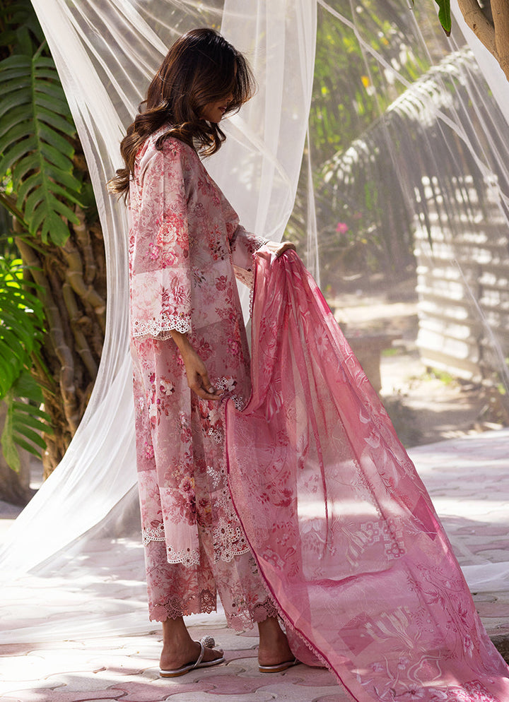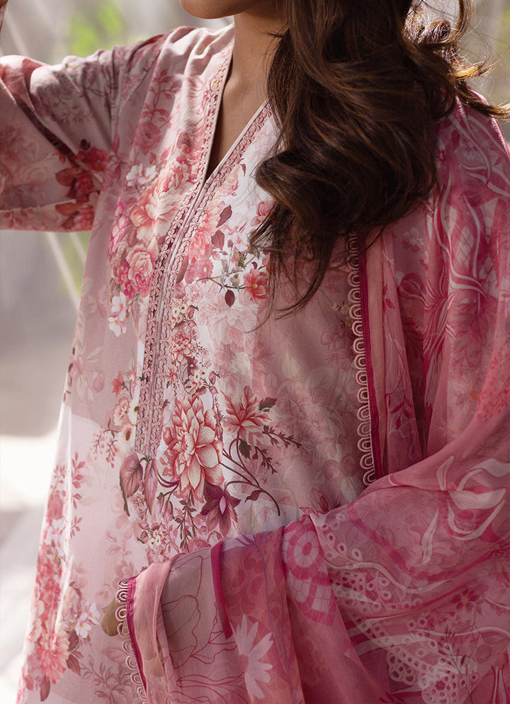 The Rose Pink Cotton Chiffon Embroidered Printed 3pc Suit from Summer Essence '25, features V neckline & full-length sleeves paired with embroidered trousers & chiffon dupatta.
