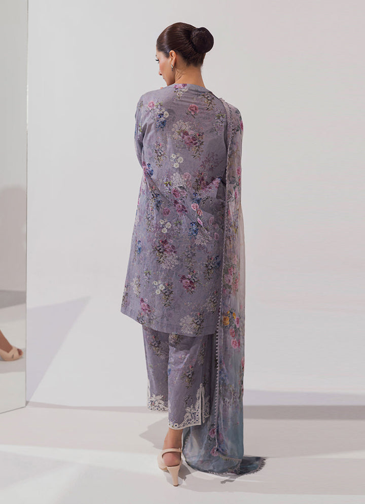 The Grey Cotton/Chiffon 3PC Embroidered Printed Suit from our Spring Collection features a printed shirt with cutwork embroidery, band collar, three quarter sleeves, paired with cutwork embroidered trouser & dupatta.