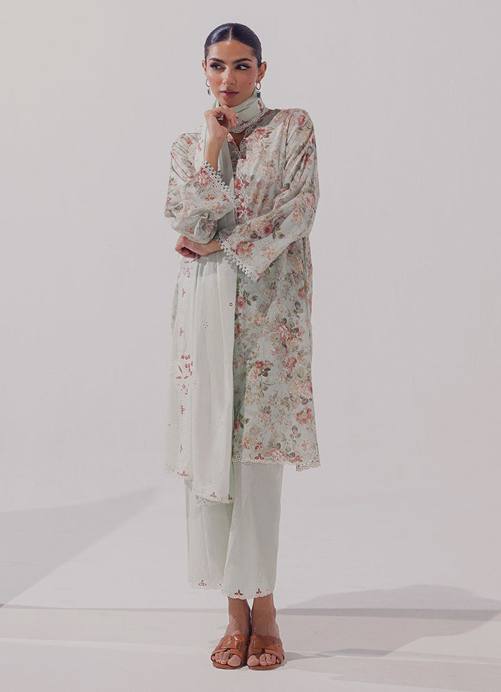 The Mint Green Cotton 3PC Embroidered Printed Suit from our Spring Collection features a printed shirt with cutwork embroidery, V neckline, full length sleeves, paired with cutwork embroidered trouser & dupatta.