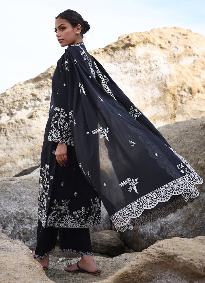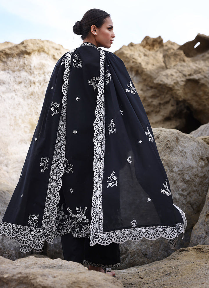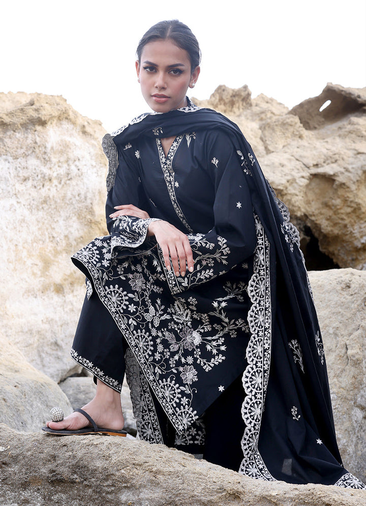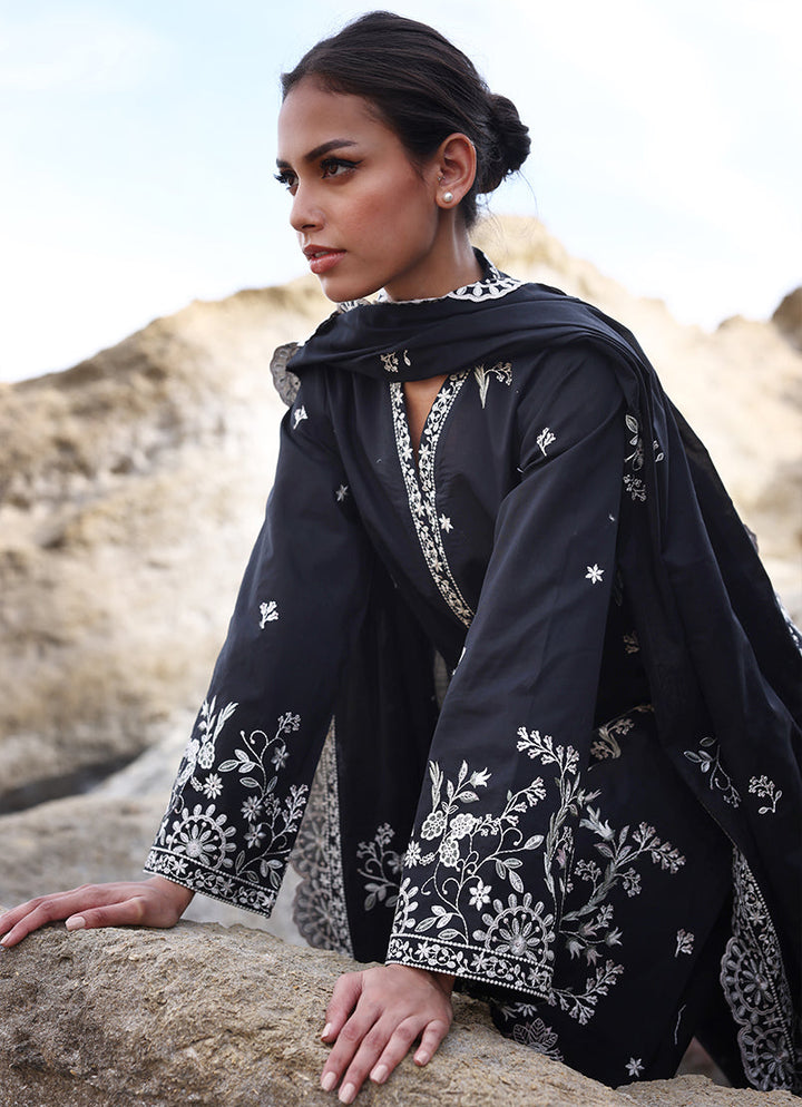 The Black Cotton Embroidered 3-Pc Suit from our Spring Pret '25 collection features an embroidered shirt with V neckline paired with embroidered trousers & dupatta.