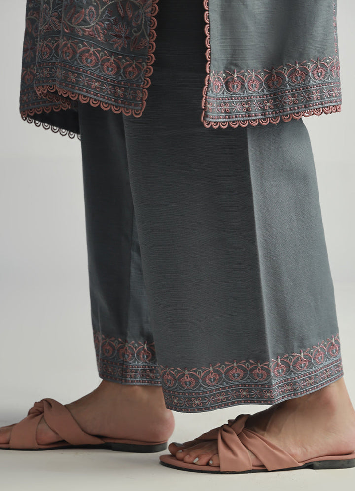 The Grey/Mauve Khaddar Embroidered 3-Piece Suit from our Legends of Fall '24 Collection. A straight silhouette, V neckline, full length sleeves with lace embellishment, paired with trousers & embroidered acrylic shawl.