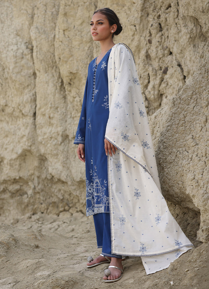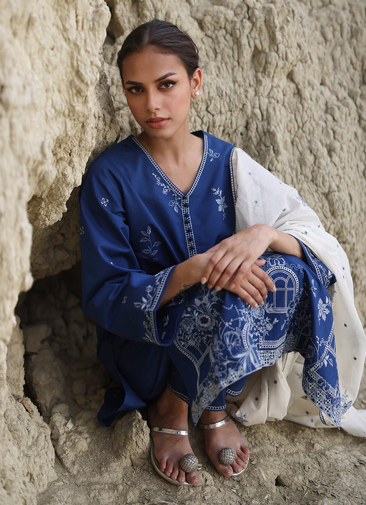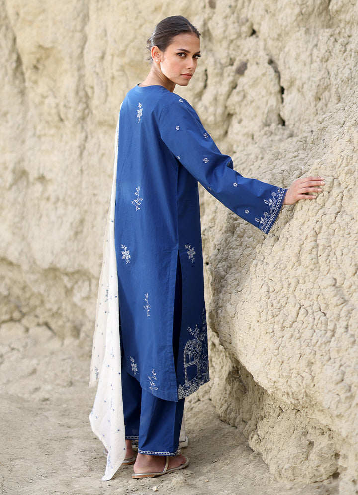 The Electric Blue/Kora Cotton Embroidered 3-Pc Suit from our Spring Pret '25 collection features an embroidered shirt with V neckline, full length sleeves paired with embroidered trousers & dupatta.