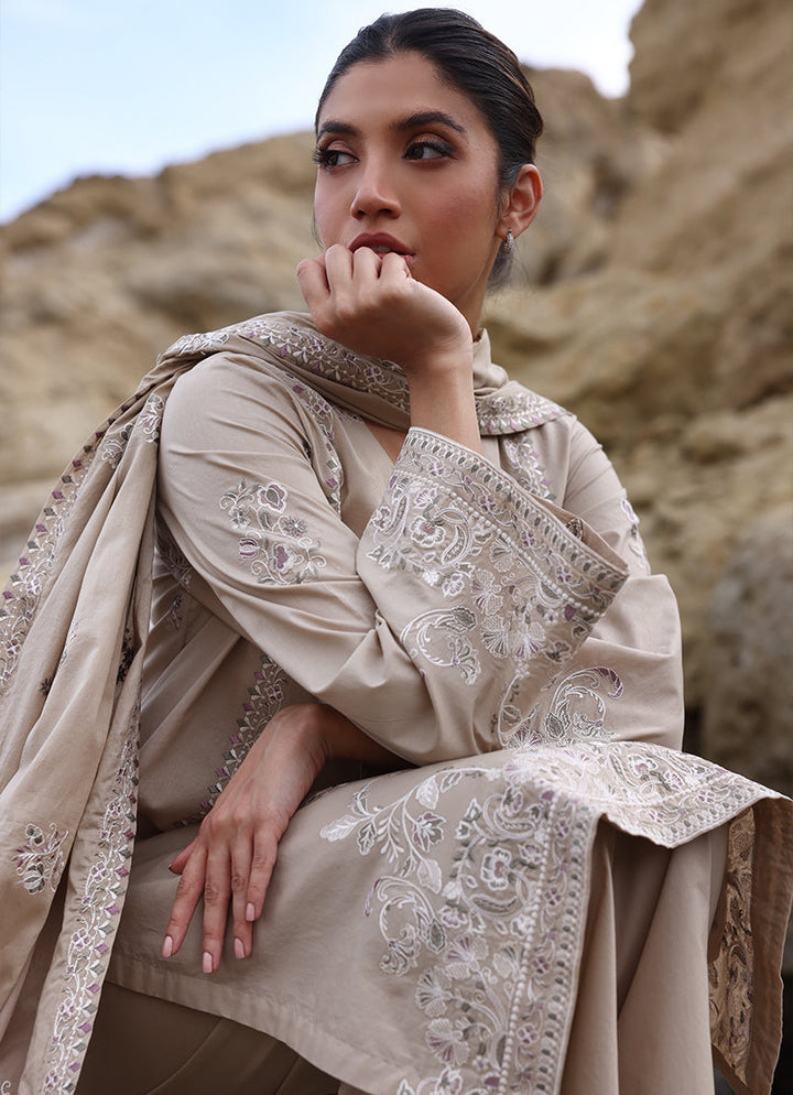The Beige Cotton Embroidered 3-Pc Suit from our Spring Pret '25 collection features an embroidered shirt with V neckline, full length sleeves paired with embroidered trousers & dupatta.
