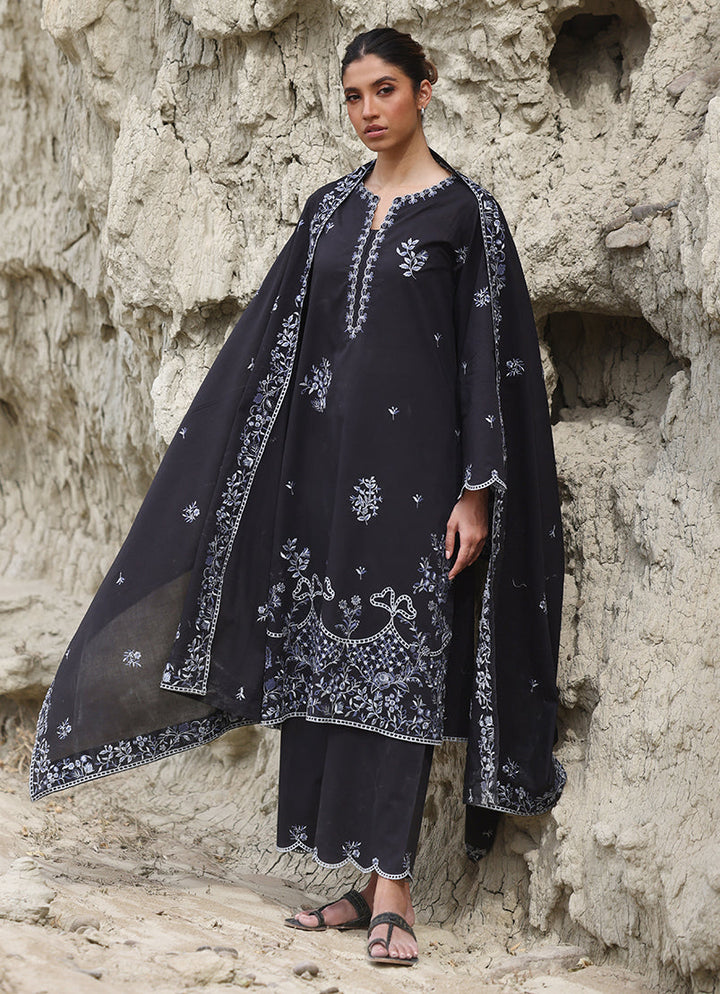 The Black Cotton Embroidered 3-Pc Suit from our Spring Pret '25 collection features an embroidered shirt with round neckline with a slit, full length sleeves paired with embroidered trousers & dupatta.