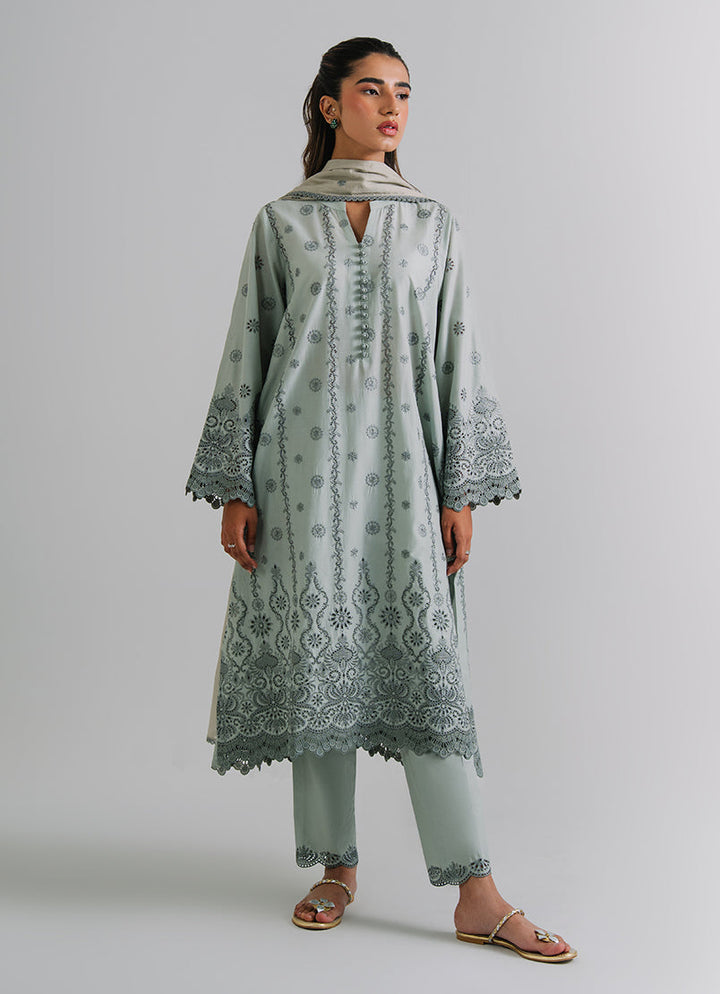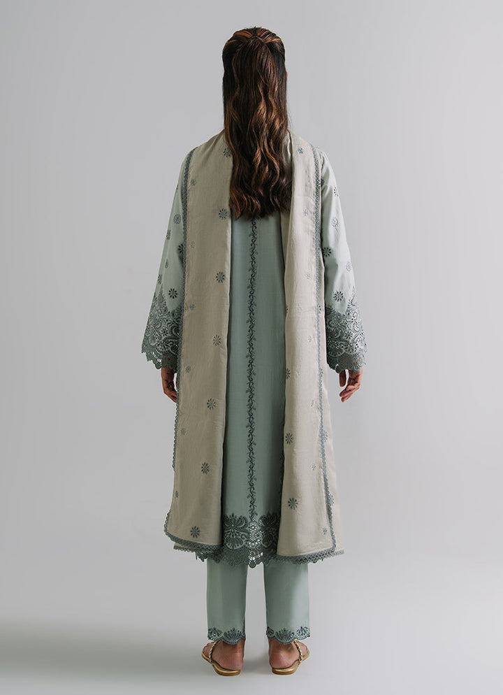 The Dull Olive 3 PC Cotton Embroidered Suit from our Image Signature category features band collar & full-length bell sleeves paired with embroidered trousers & dupatta