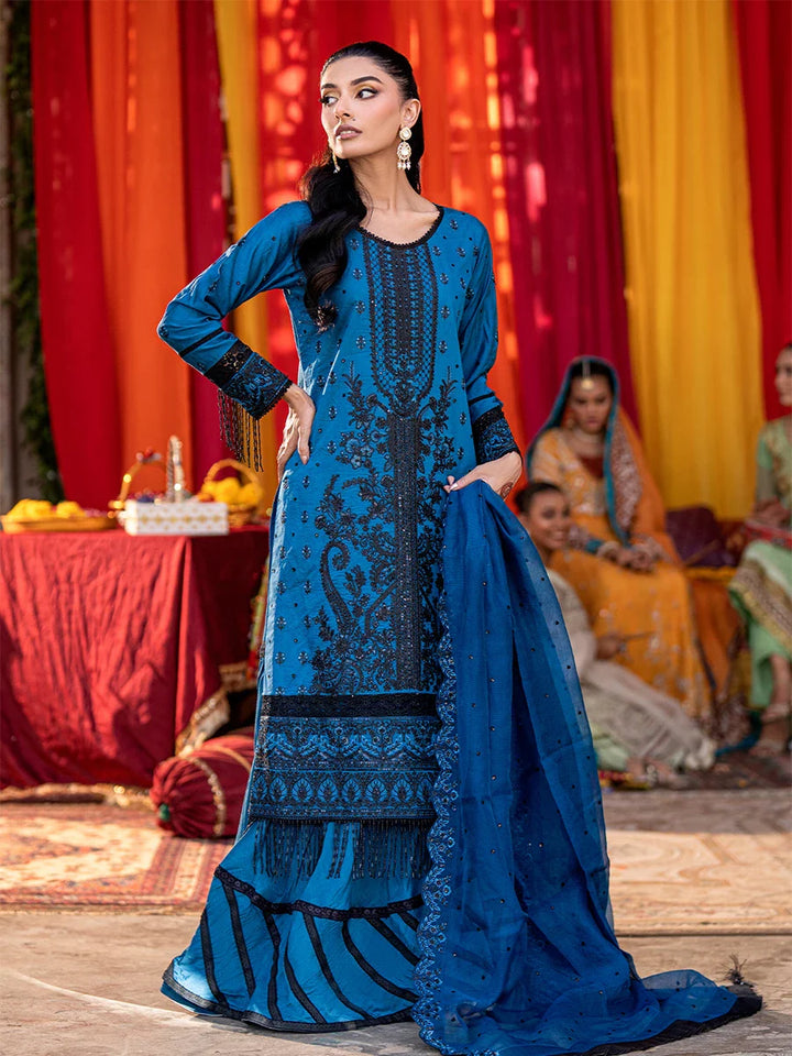 Celebrate tradition with our 3PC Unstitched Festive Embroidered Suit. Designed with meticulous embroidery on premium fabric, this outfit offers versatility and sophistication, making it an ideal choice for any special occasion.