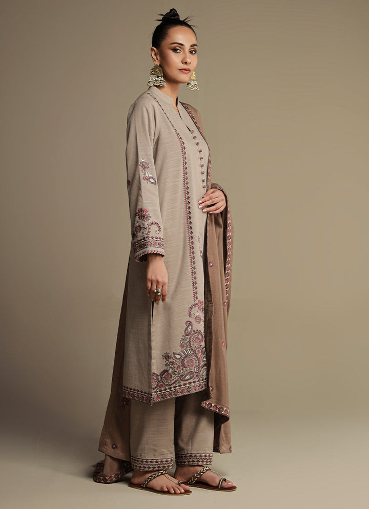 The Beige/Brown Khaddar Embroidered 3-Piece Suit from our Winter Pret '24 Collection. A straight silhouette, band collar with a slit finished with buttons, full length embroidered sleeves, paired with embroidered trousers & acrylic shawl.