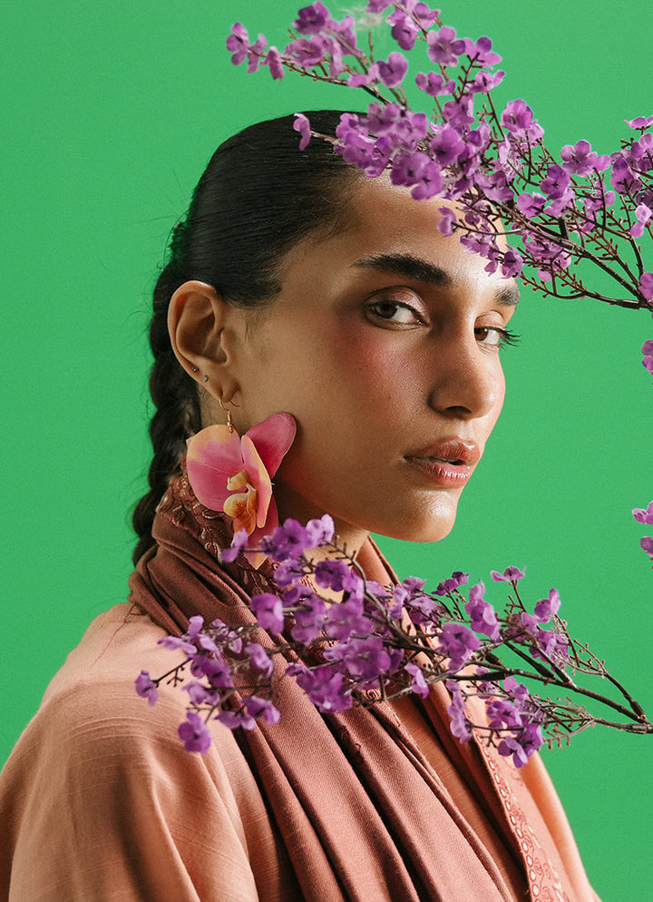 The Light Orange/Peach Khaddar Embroidered 3-Piece Suit from our Winter Pret '24 Collection. A straight silhouette, round neckline with a slit, full length embroidered sleeves, paired with embroidered izaar & acrylic shawl.