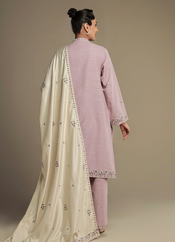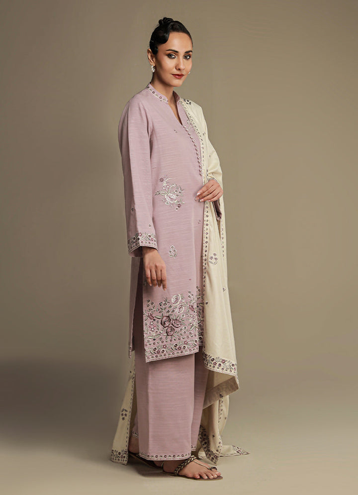 The Mauve/Ivory Khaddar Embroidered 3-Piece Suit from our Winter Pret '24 Collection. A straight silhouette, band collar with a slit, full length embroidered sleeves paired with embroidered izaars & acrylic shawl.