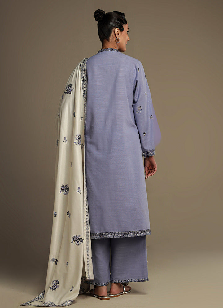 The Periwinkle Blue/ Ivory Khaddar Embroidered 3-Piece Suit from our Winter Pret '24 Collection. A knee length shirt, V neckline, full length embroidered bell sleeves paired with embroidered izaars & acrylic shawl.