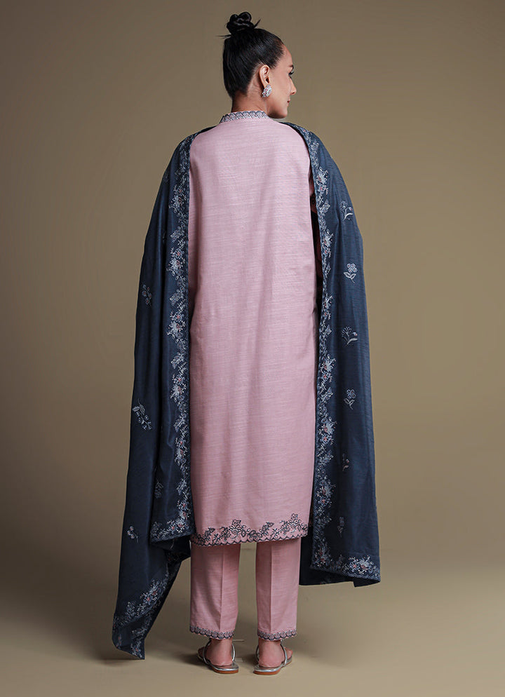 The Tea Pink/Charcoal Grey Khaddar Embroidered 3-Piece Suit from our Winter Pret '24 Collection. A straight silhouette, V neckline, full length embroidered bell sleeves, paired with embroidered trousers & acrylic shawl.