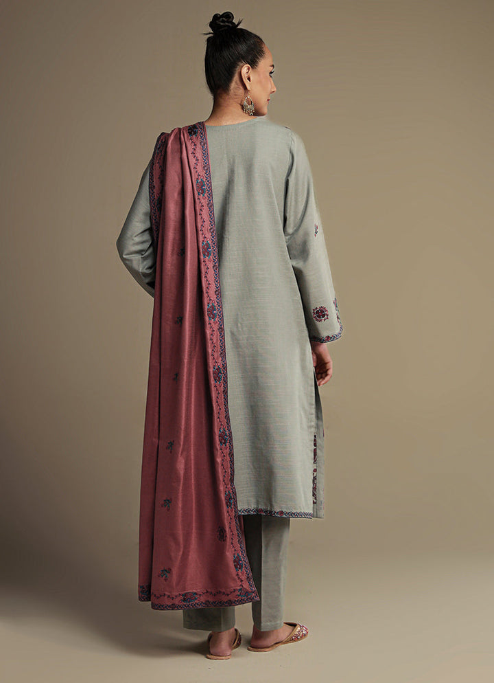 The Olive Green/Rust Twill Viscose Embroidered 3-Piece Suit from our Winter Pret '24 Collection. A straight silhouette, V neckline with button finishing, full length embroidered sleeves paired with embroidered izaars & shawl.