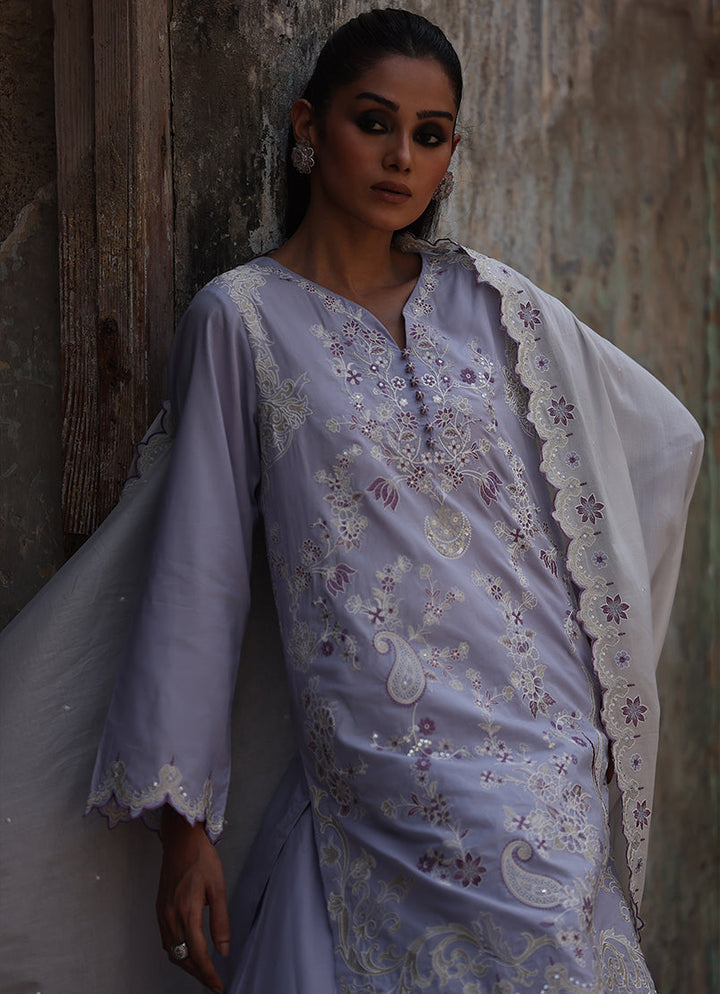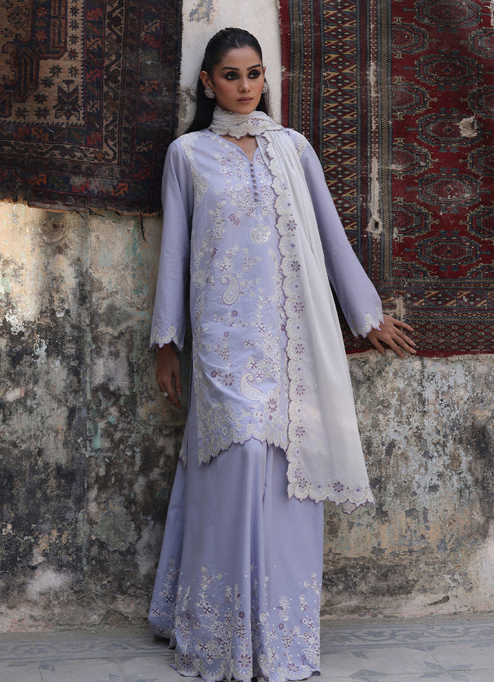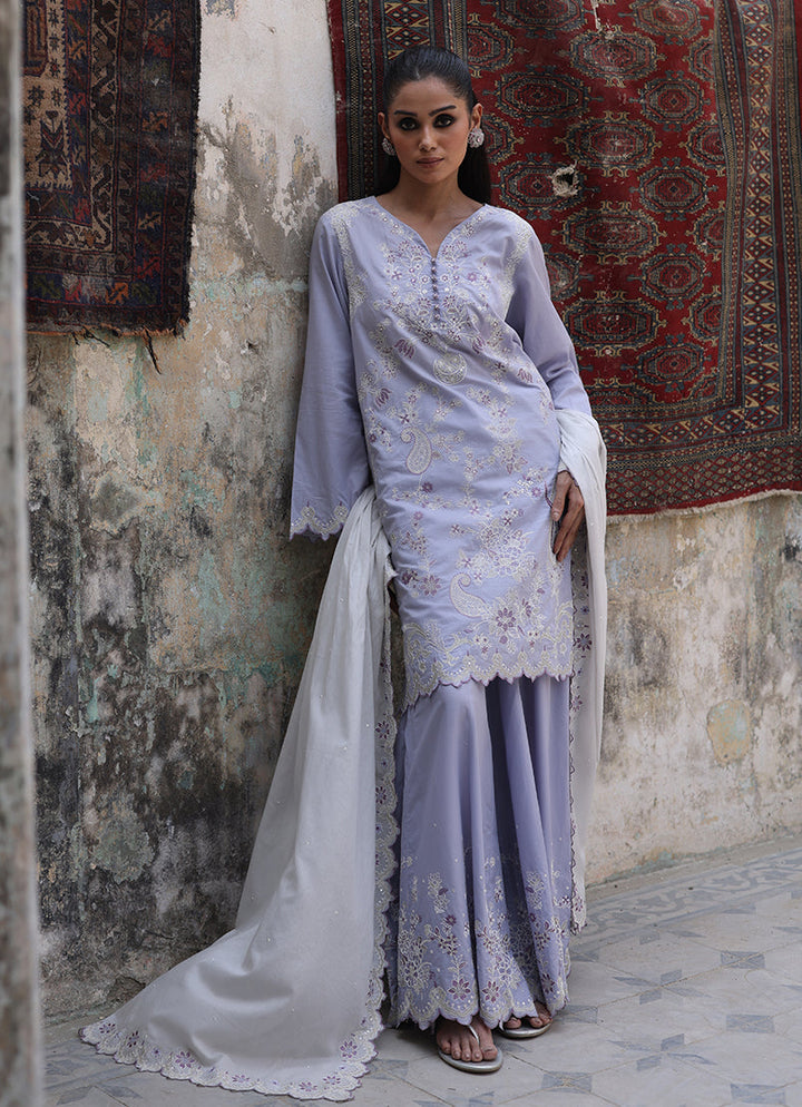 The Lavender/Grey Cotton 3PC Gharara Set from our Image Luxury category, features a short shirt with V neckline, full length sleeves paired with an embroidered gharara and dupatta.