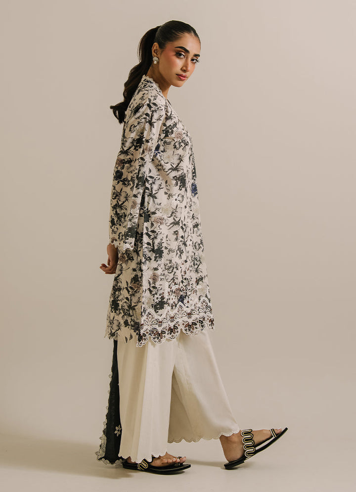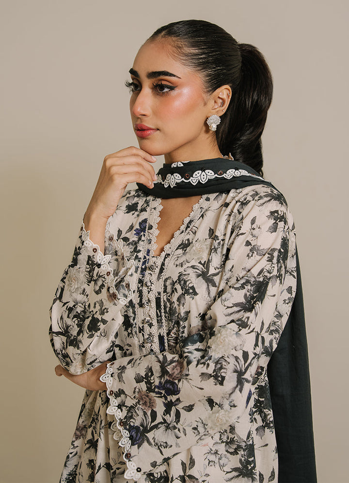 The Black Cotton Embroidered 3pc Suit from our IM Print category features V neckline & full-length bell sleeves paired with embroidered dupatta & straight trousers.