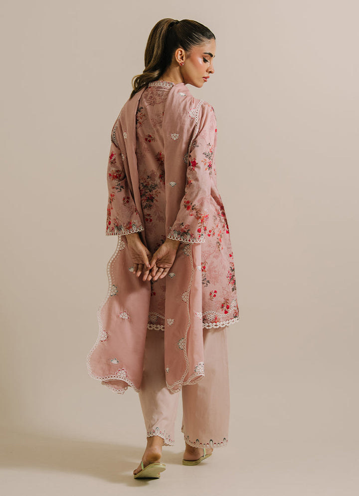 The Tan Pink Cotton Embroidered 3pc Suit from our IM Print category features V neckline & full-length bell sleeves paired with embroidered dupatta & straight shalwar.