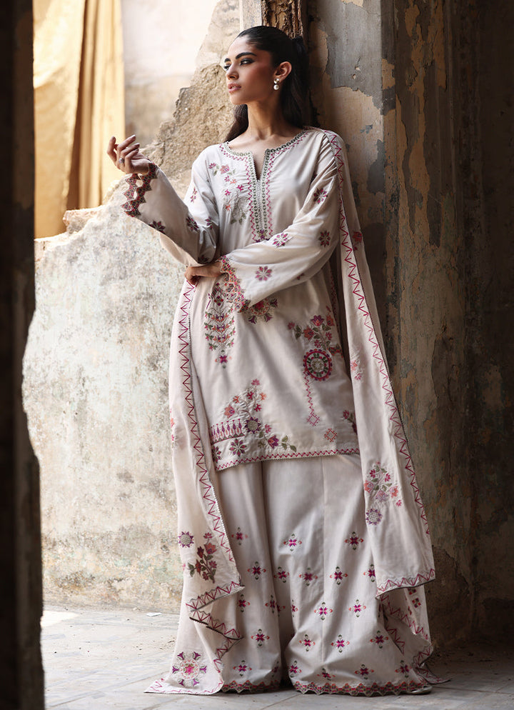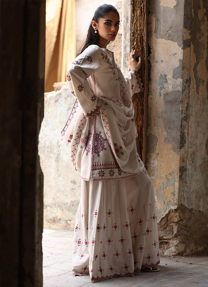 The Ivory Cotton 3PC Gharara Set from our Image Luxury category, features a short shirt with round neckline with a slit, full length sleeves paired with an embroidered gharara and dupatta.