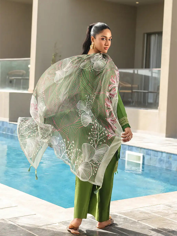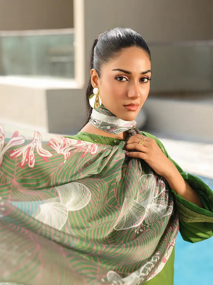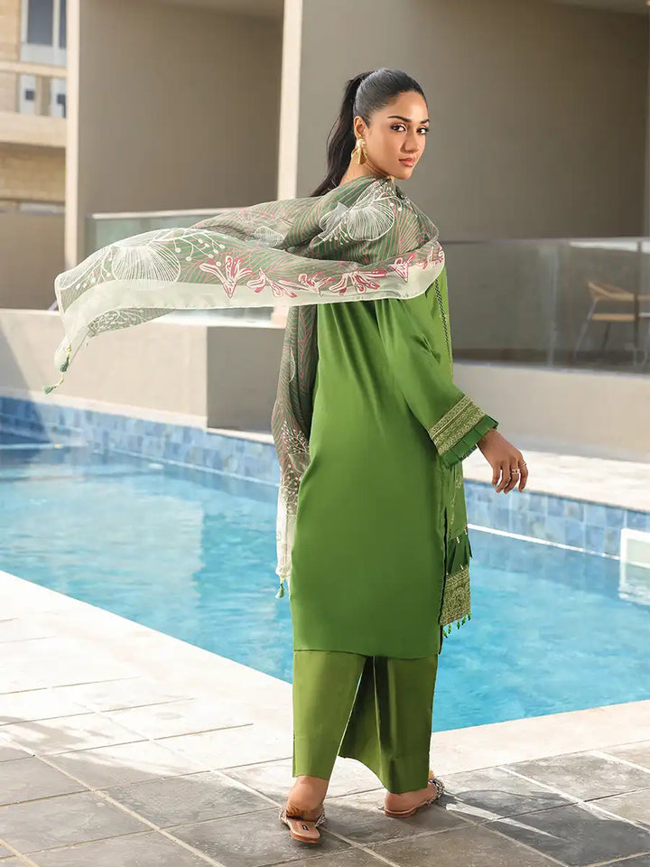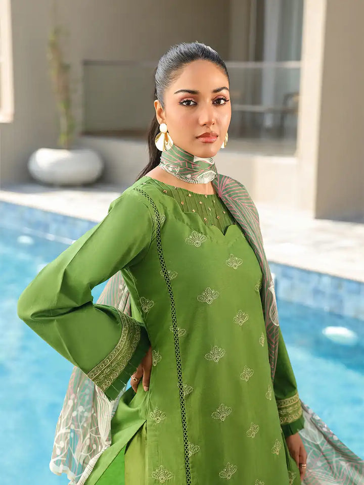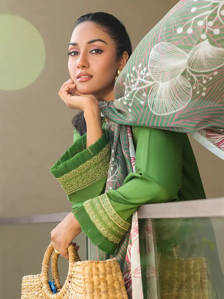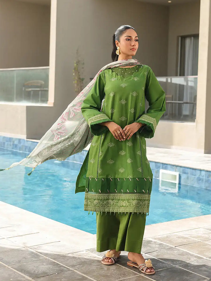 A stylish outfit featuring an embroidered lawn shirt, paired with an embroidered dupatta and a plain cambric trouser. Designed to offer comfort and elegance for any occasion, it's a versatile choice for Casual or festive Wear.