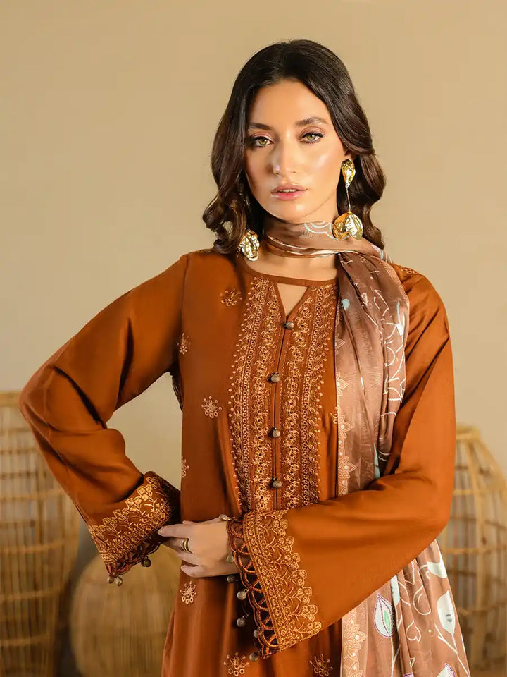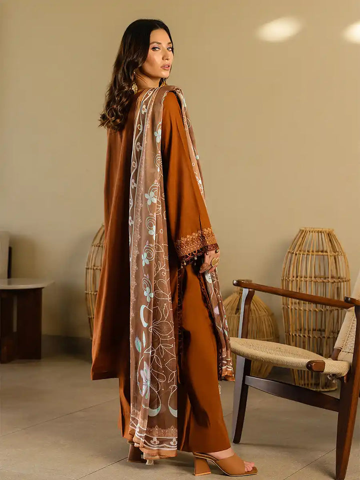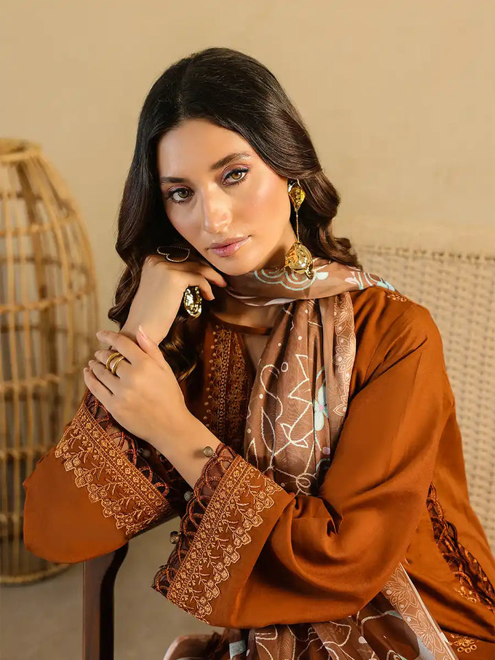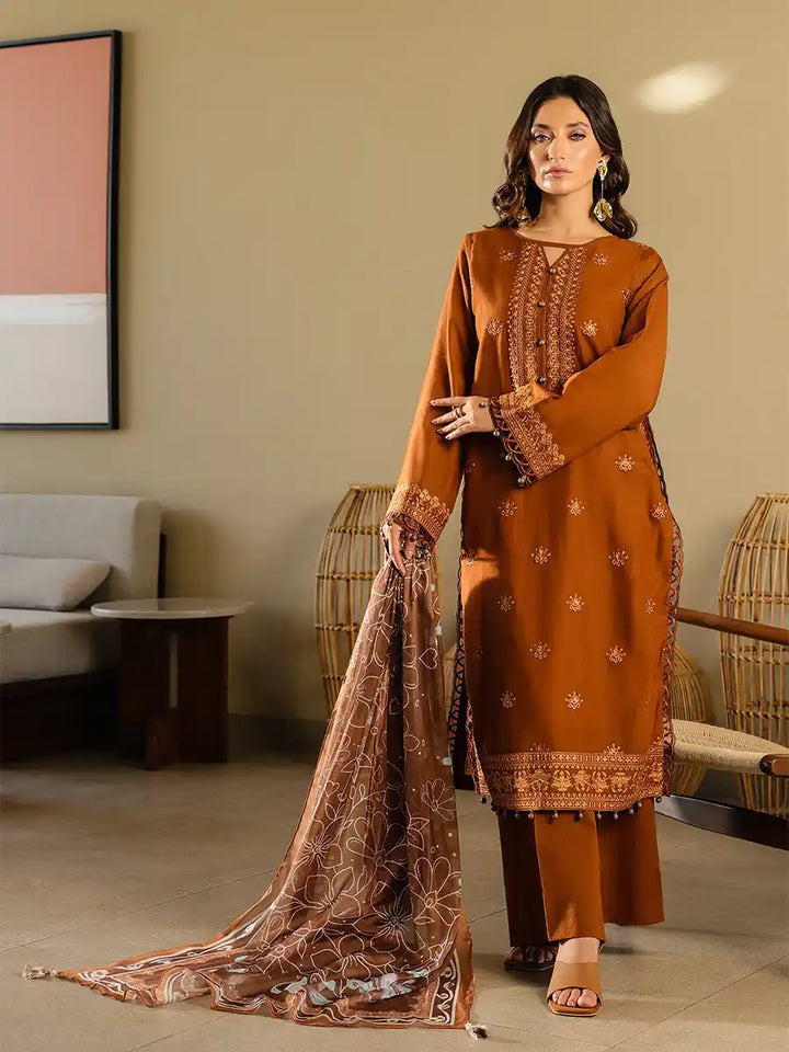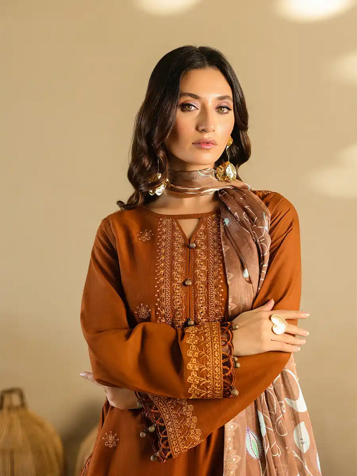 A stylish outfit featuring an embroidered lawn shirt, paired with an embroidered dupatta and a plain cambric trouser. Designed to offer comfort and elegance for any occasion, it's a versatile choice for Casual or festive Wear.