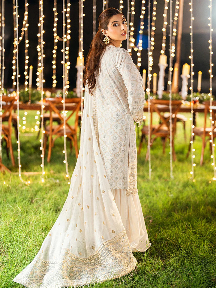Immerse yourself in the captivating charm of Noor e Khaas, a collection that celebrates the timeless beauty of pristine white. Each piece embodies purity, and grace, bringing refinement perfect for your Eid celebrations.
