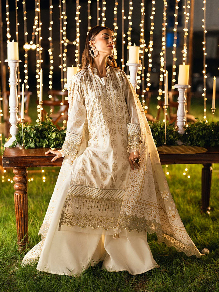 Immerse yourself in the captivating charm of Noor e Khaas, a collection that celebrates the timeless beauty of pristine white. Each piece embodies purity, and grace, bringing refinement perfect for your Eid celebrations.