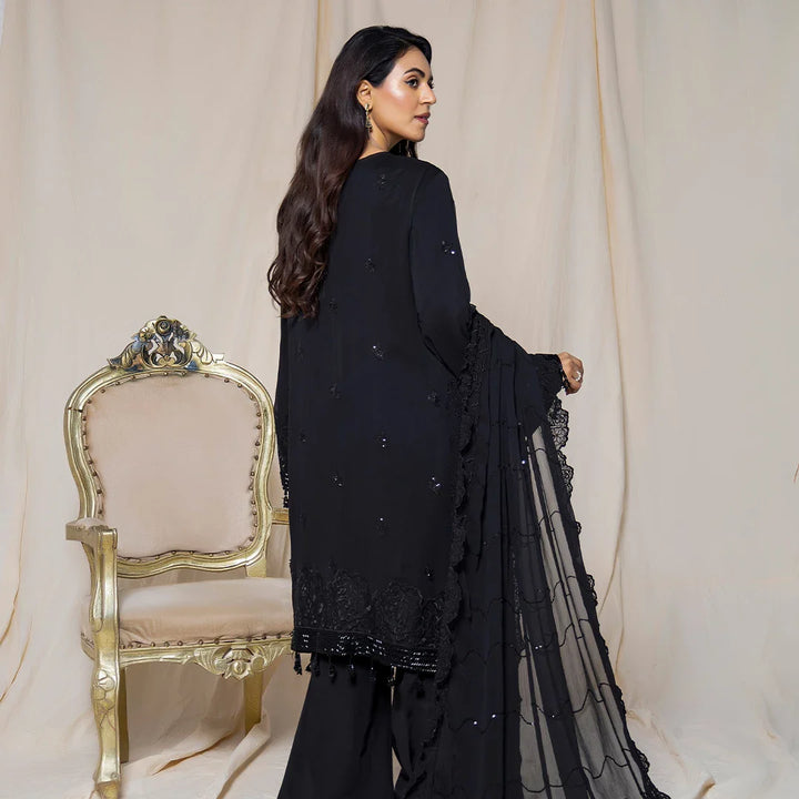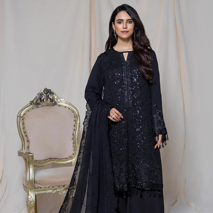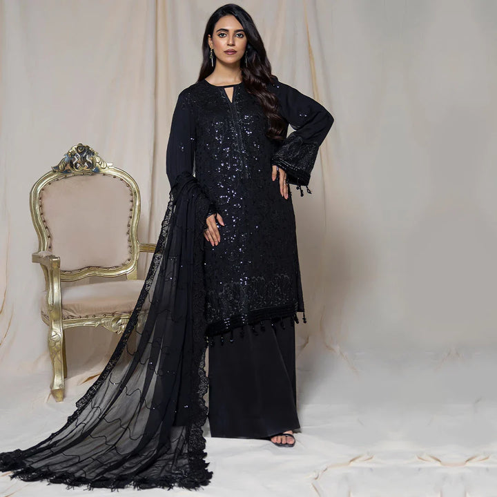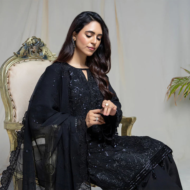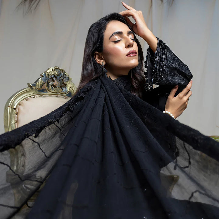 Make a bold entrance with our statement black chiffon 3-piece, featuring a dyed embroidered dupatta for an unforgettable, regal allure