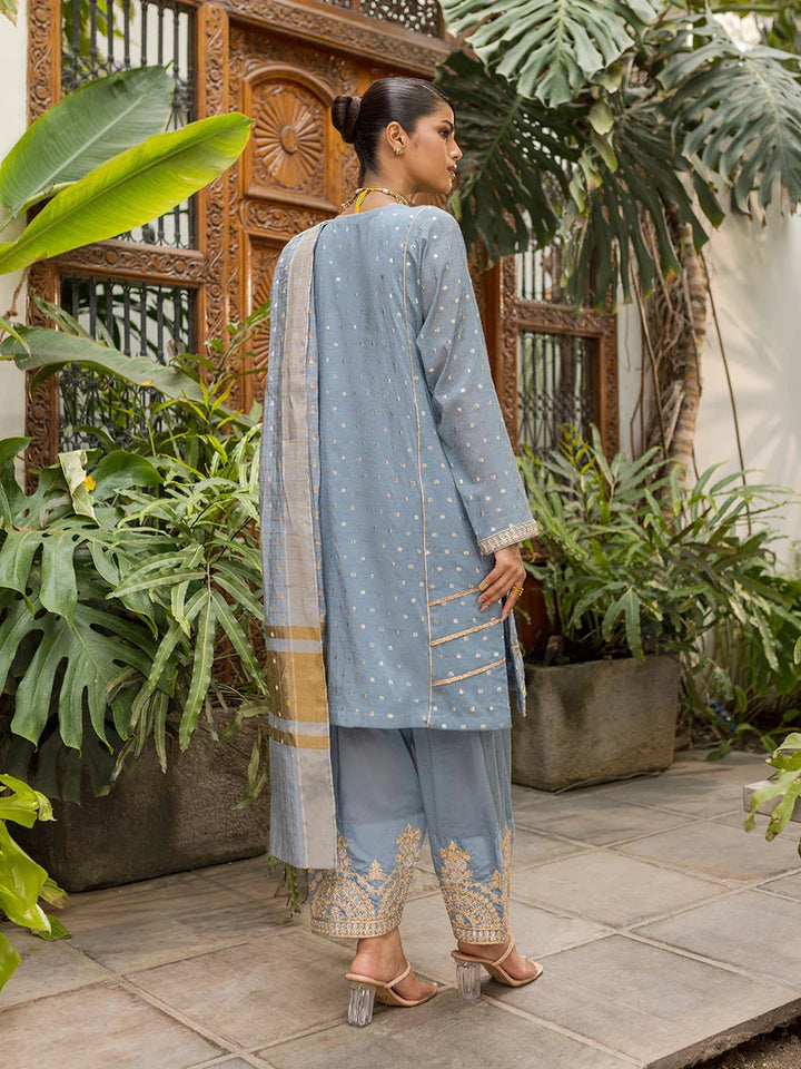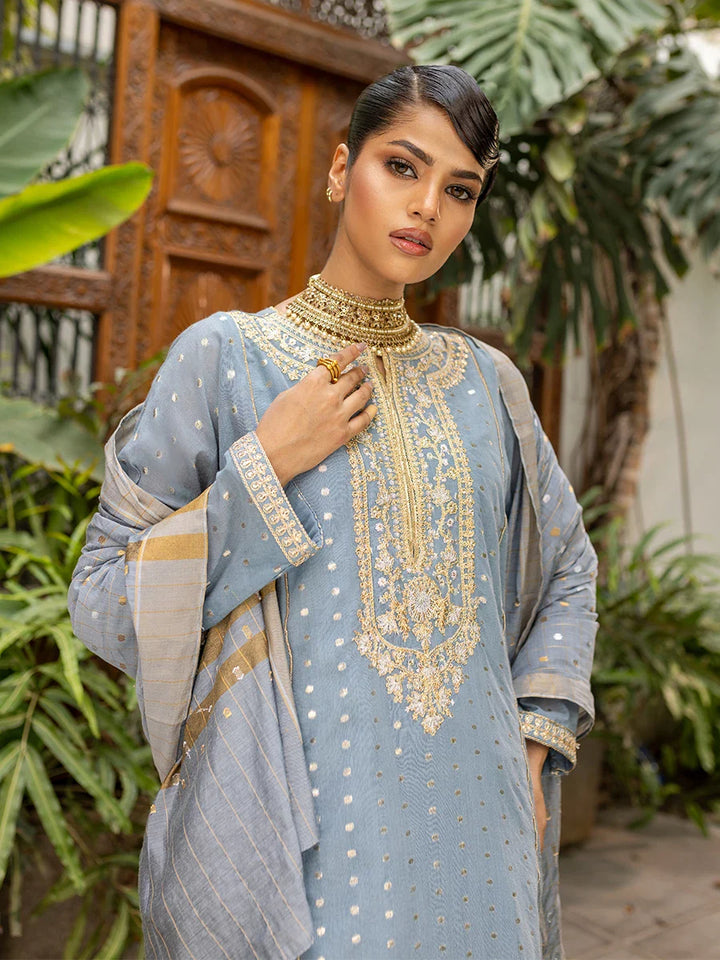 Elegance redefined with our 3-panel embroidered shirt in blue-grey, featuring lace accents on the sleeves, neckline, and hem. Paired with a shalwar and yarn-dyed dupatta for a timeless look.