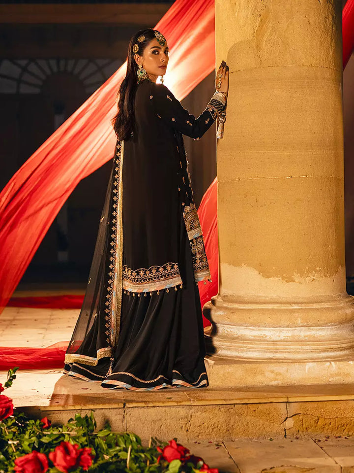 Mesmerise the wedding entourage in this noir-black chiffon offering with Zari sequin embroidery, offset with a sky-blue blush-pink and white chevron strip border, regally dovetailed with dyed raw silk lowers and an opulent Zari sequin- embroidered chiffon dupatta.