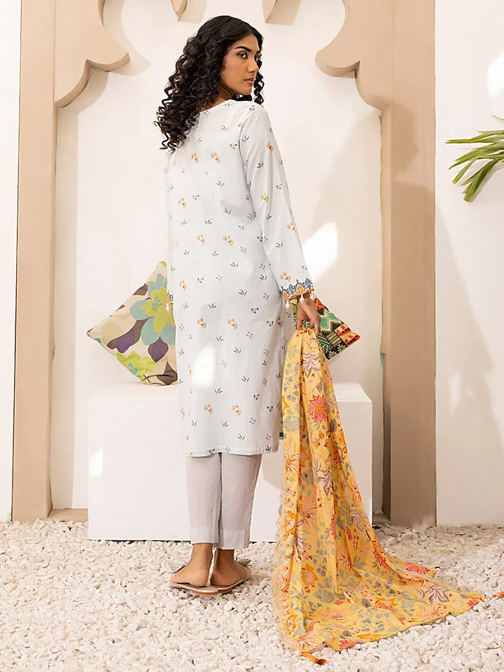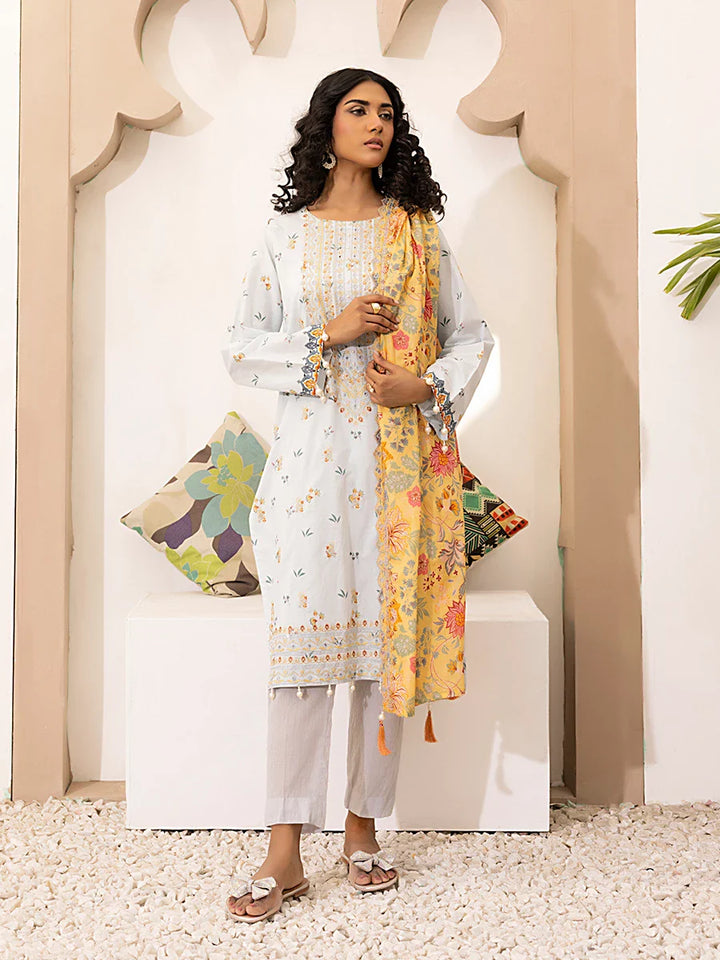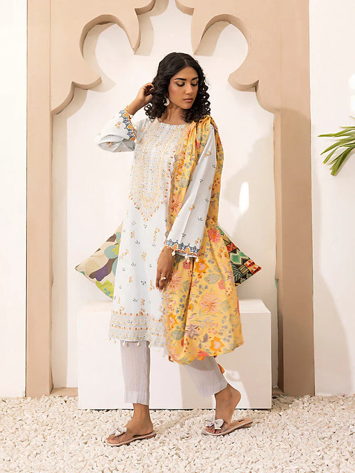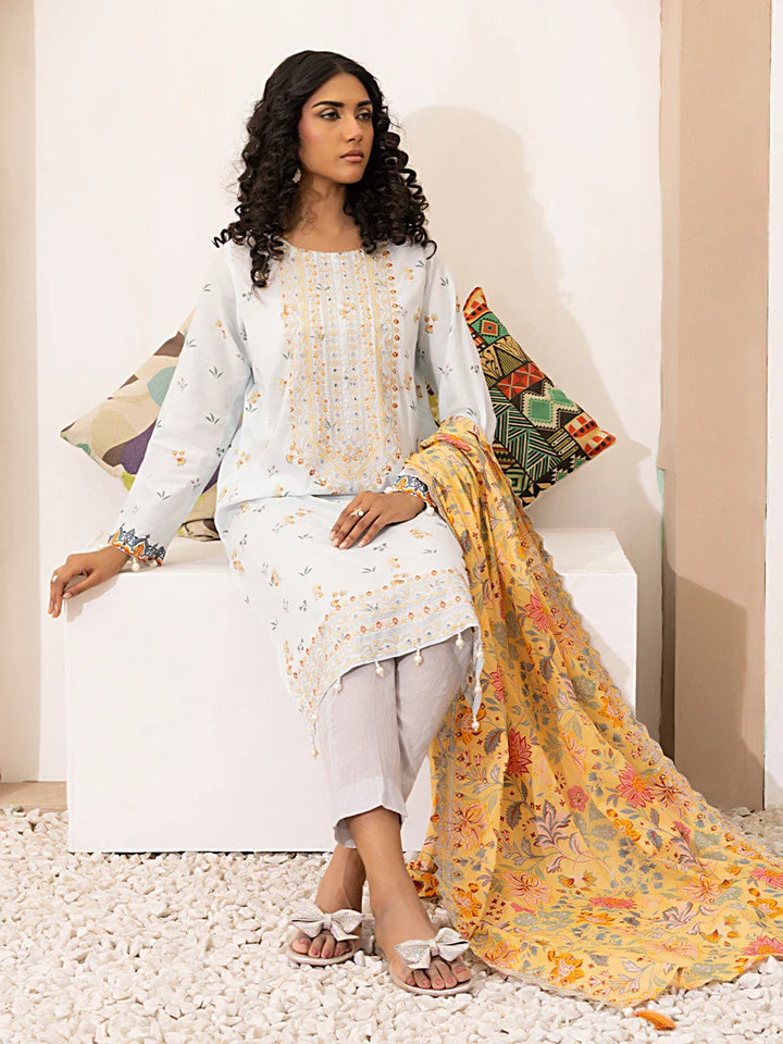 Discover elegance and comfort with this beautifully designed women's ensemble. The lawn shirt features intricate prints and embroidery, complemented by a finely embroidered dupatta for a graceful touch. Paired with a soft cambric dyed trouser, this outfit offers the perfect blend of style and ease, making it an ideal choice for both casual and semi-formal occasions.