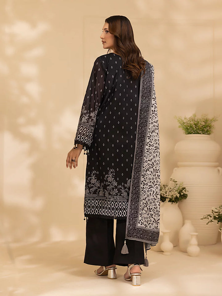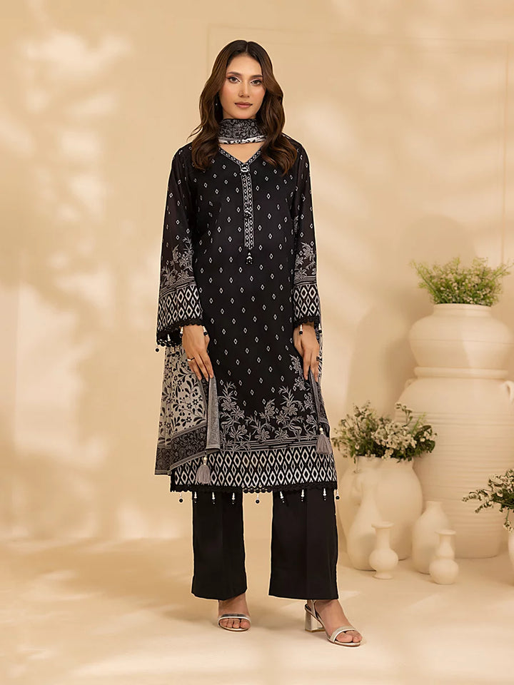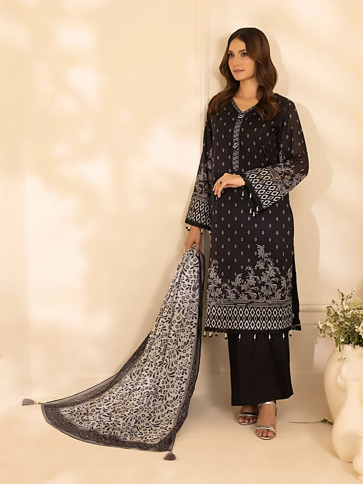 Style up your wardrobe with 3-Piece Unstitched Black & white Lawn Collection. Featuring a vibrant Lawn printed shirt, cambric dyed trouser, and a beautifully Lawn printed dupatta.