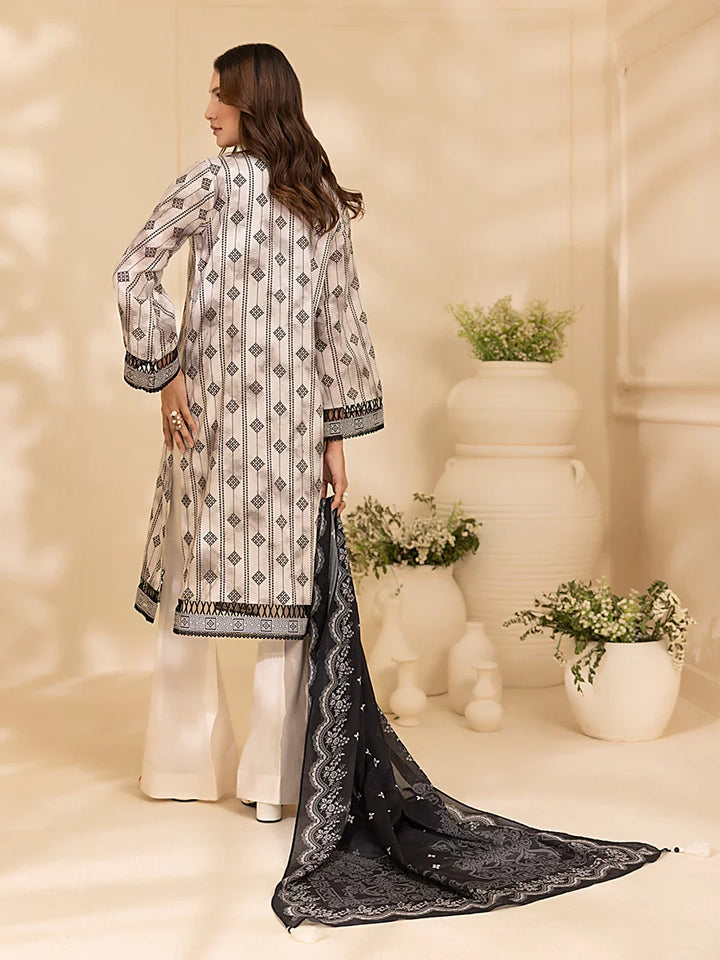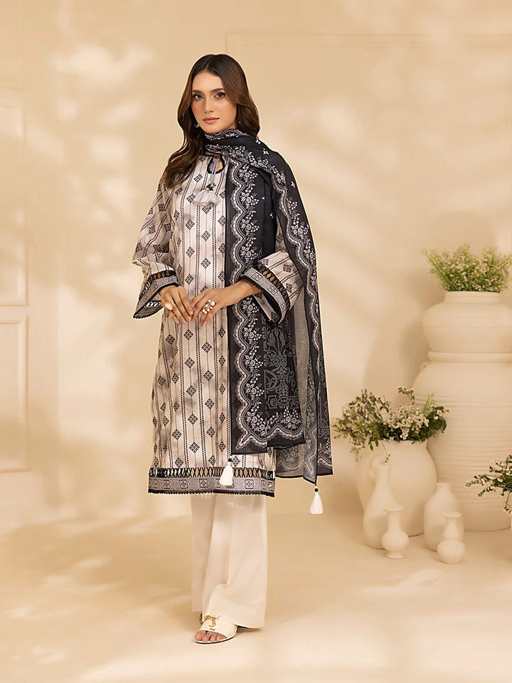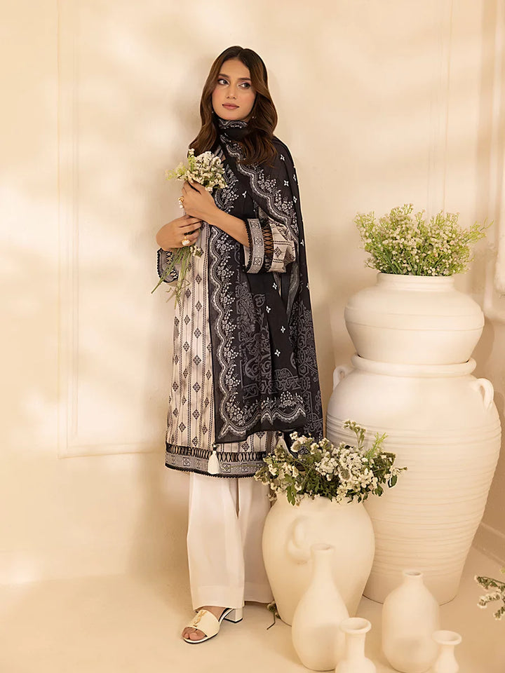 Style up your wardrobe with 3-Piece Unstitched Black & white Lawn Collection. Featuring a vibrant Lawn printed shirt, cambric dyed trouser, and a beautifully Lawn printed dupatta.
