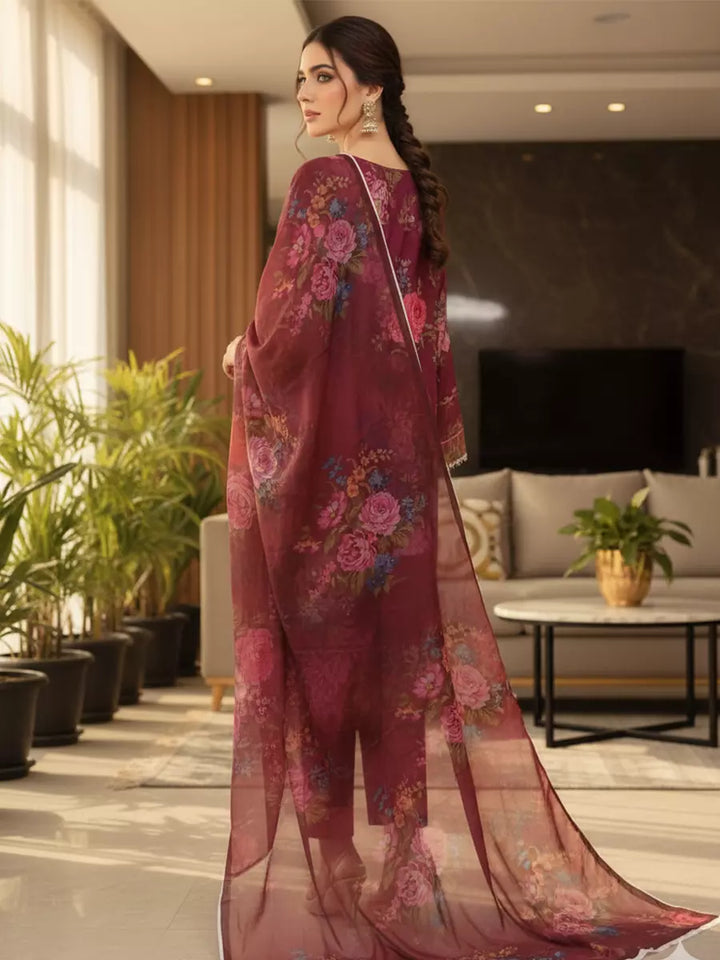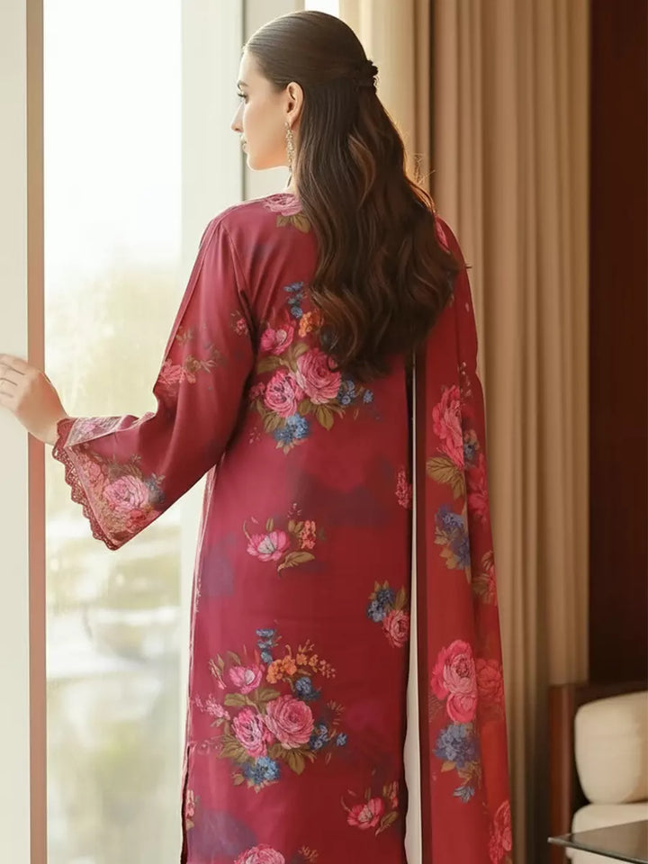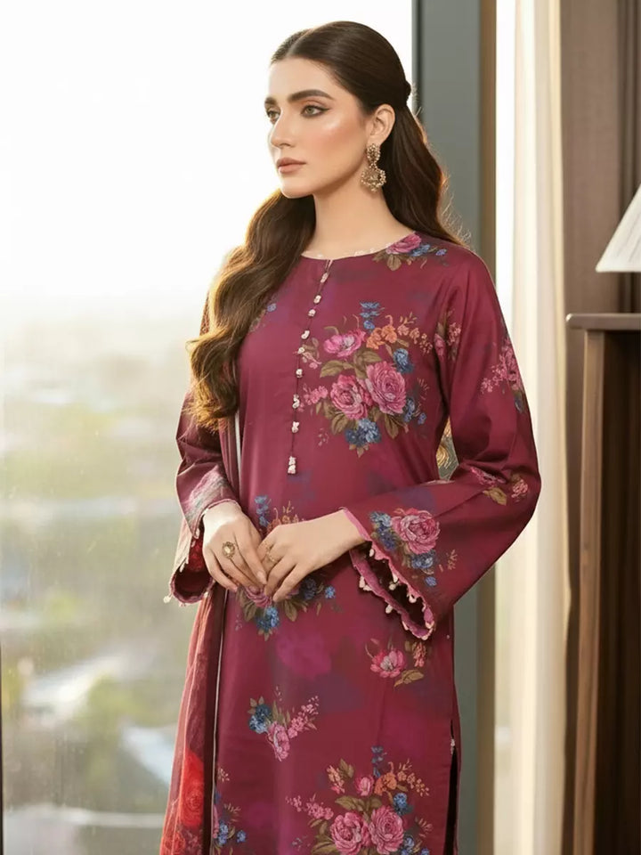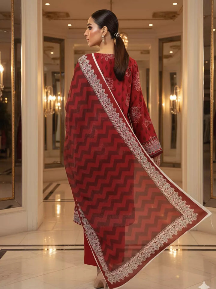 Style up your wardrobe with 3-Piece Unstitched Cambric Collection. Featuring a vibrant Cambric printed shirt, cambric dyed trouser, and a beautifully Lawn printed dupatta.
