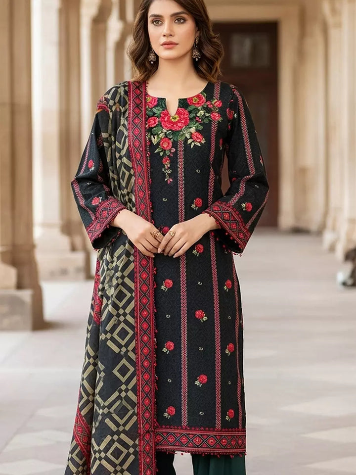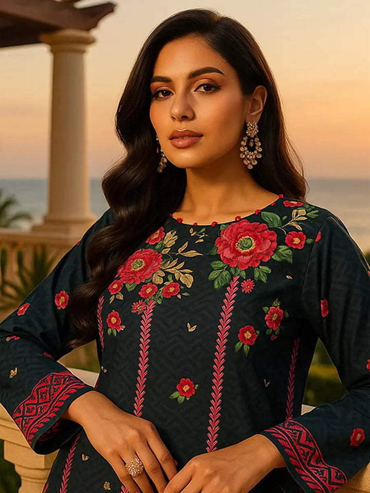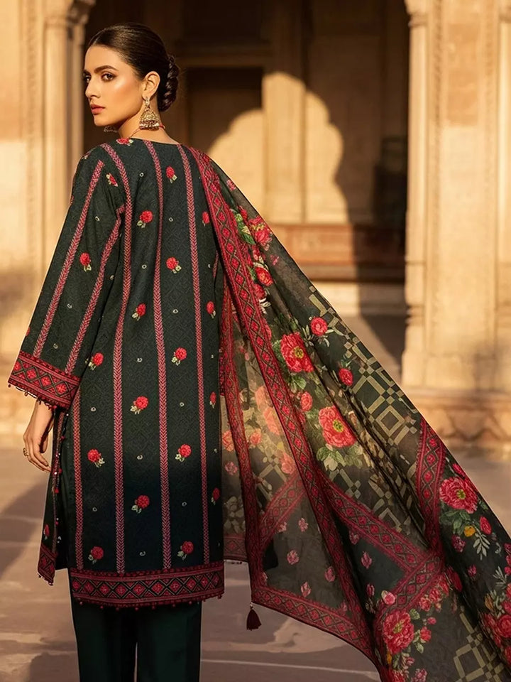 Style up your wardrobe with 3-Piece Unstitched Cambric Collection. Featuring a vibrant Cambric printed shirt, cambric dyed trouser, and a beautifully Lawn printed dupatta.