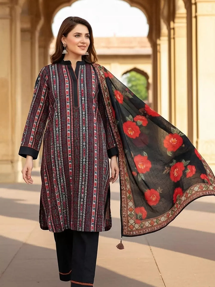 Style up your wardrobe with 3-Piece Unstitched Cambric Collection. Featuring a vibrant Cambric printed shirt, cambric dyed trouser, and a beautifully Lawn printed dupatta.