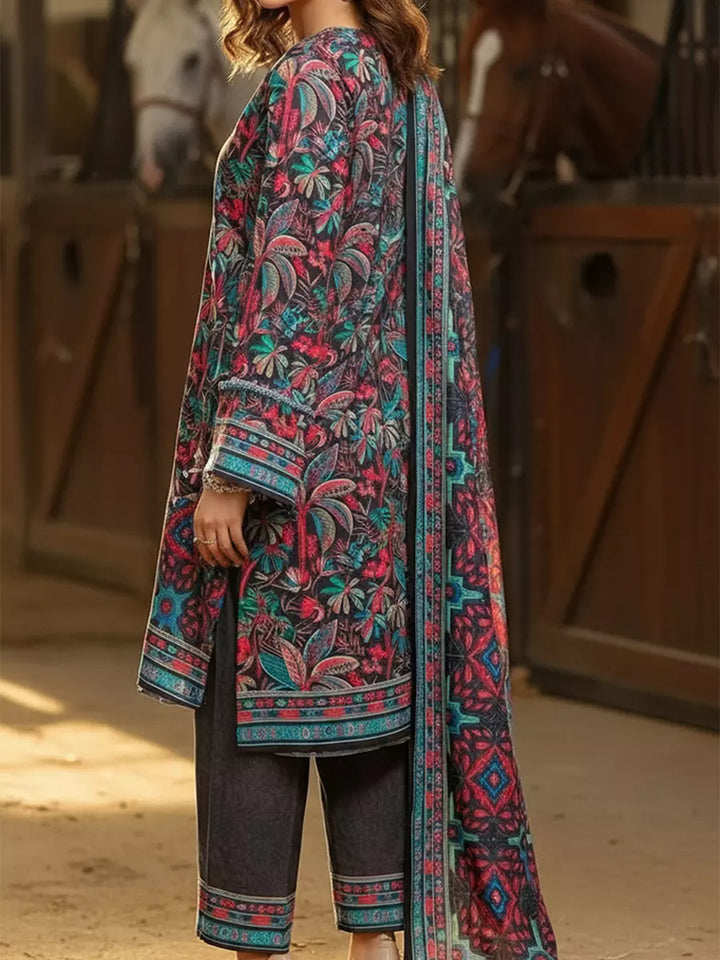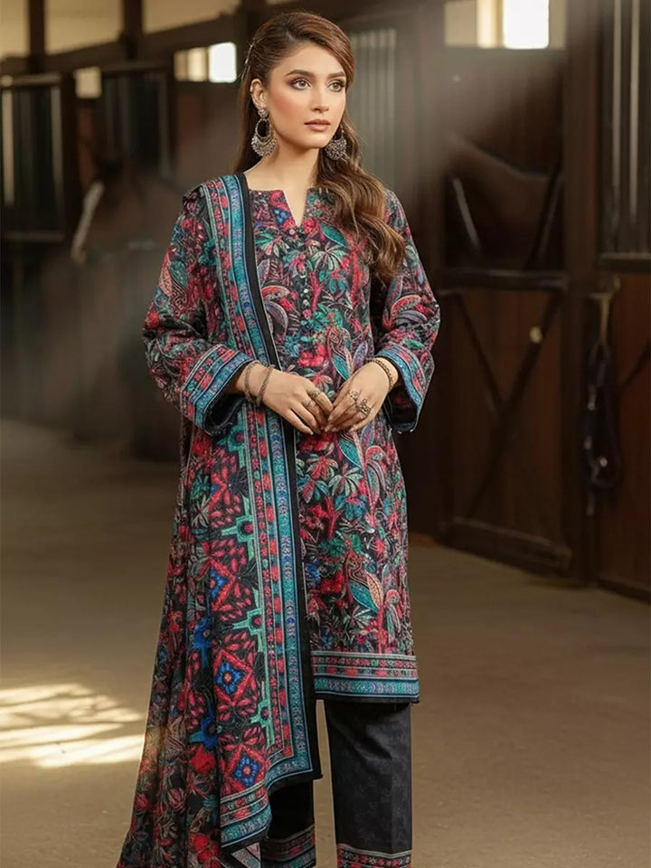 Elegant 3-piece khaddar suit featuring a beautifully printed khaddar shirt, printed khaddar dupatta, and a coordinated printed trouser. Crafted from soft winter khaddar fabric, this outfit combines comfort with timeless floral charm, perfect for everyday elegance and seasonal style.