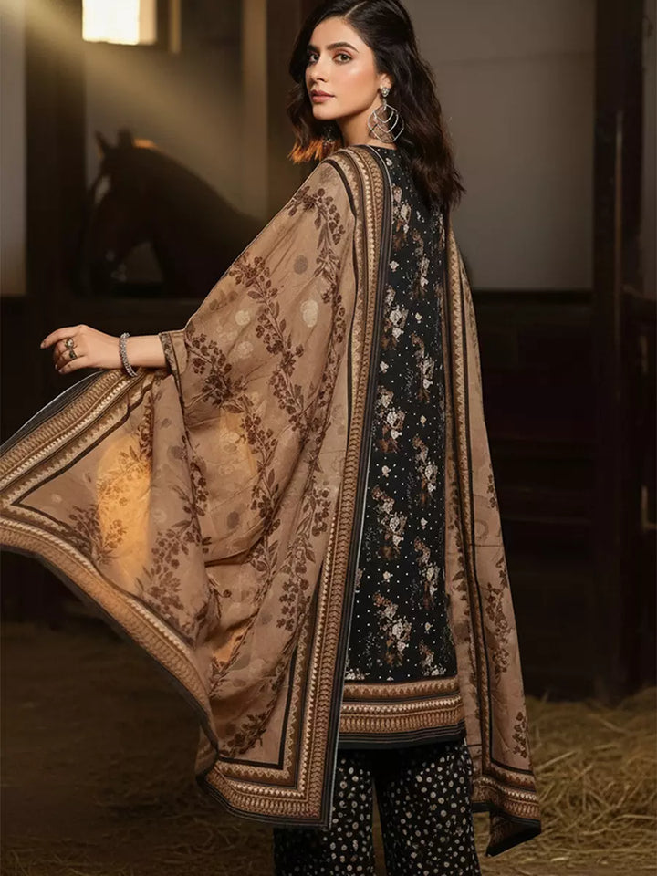 Elegant 3-piece khaddar suit featuring a beautifully printed khaddar shirt, printed khaddar dupatta, and a coordinated printed trouser. Crafted from soft winter khaddar fabric, this outfit combines comfort with timeless floral charm, perfect for everyday elegance and seasonal style.