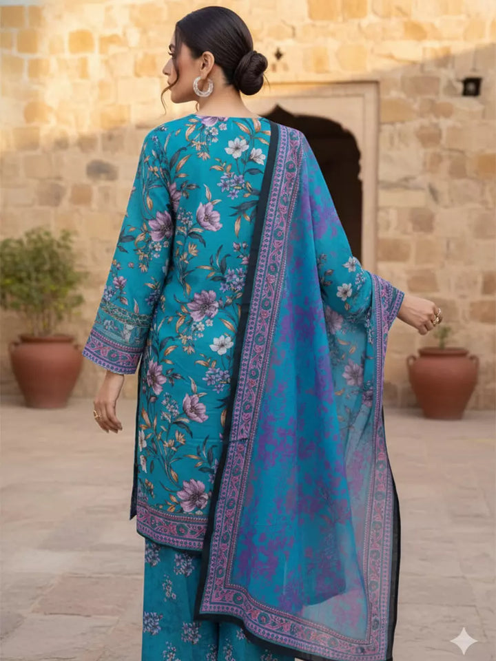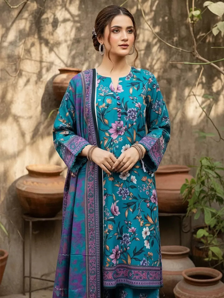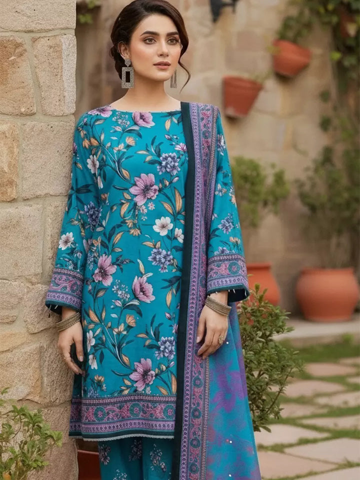 Elegant 3-piece khaddar suit featuring a beautifully printed khaddar shirt, printed khaddar dupatta, and a coordinated printed trouser. Crafted from soft winter khaddar fabric, this outfit combines comfort with timeless floral charm, perfect for everyday elegance and seasonal style.