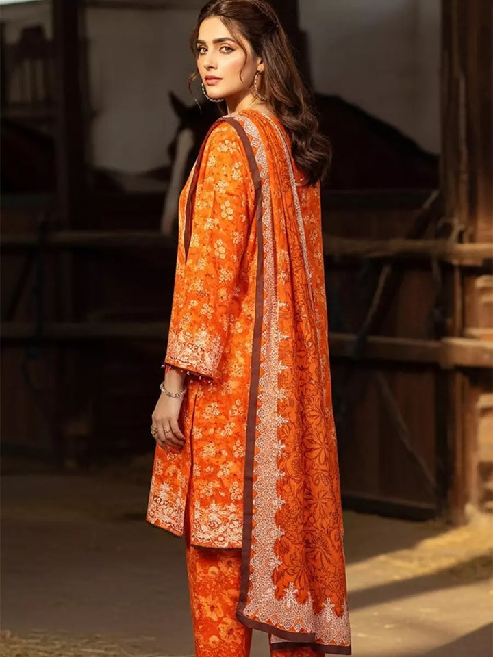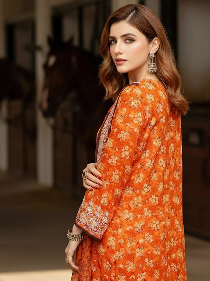 Elegant 3-piece khaddar suit featuring a beautifully printed khaddar shirt, printed khaddar dupatta, and a coordinated printed trouser. Crafted from soft winter khaddar fabric, this outfit combines comfort with timeless floral charm, perfect for everyday elegance and seasonal style.