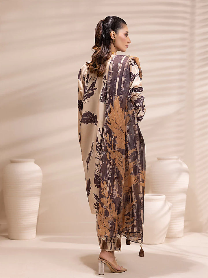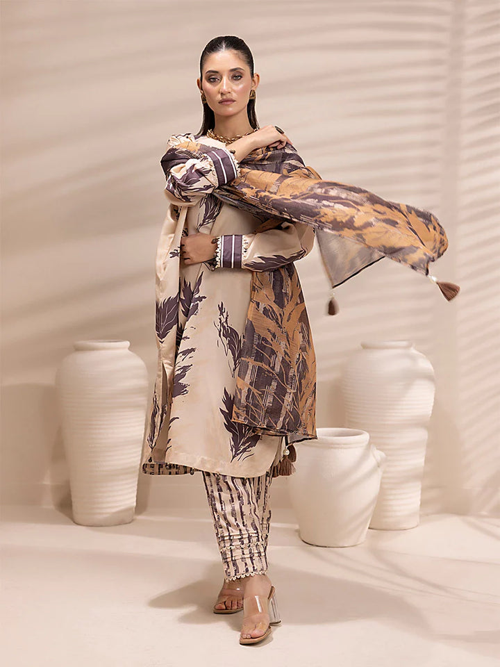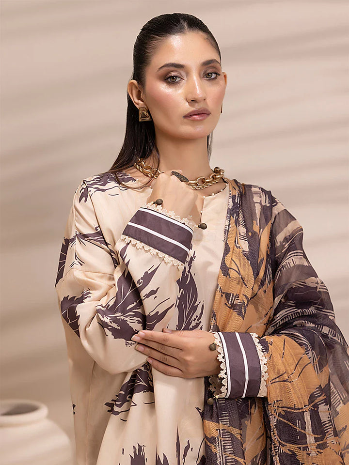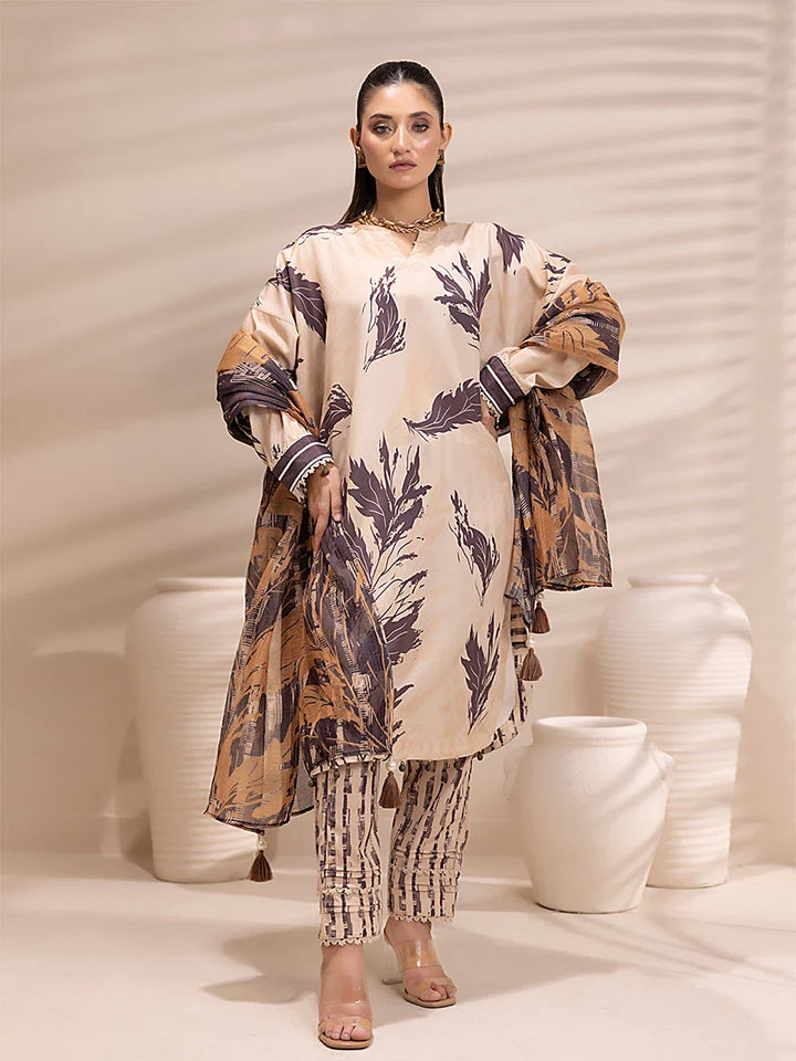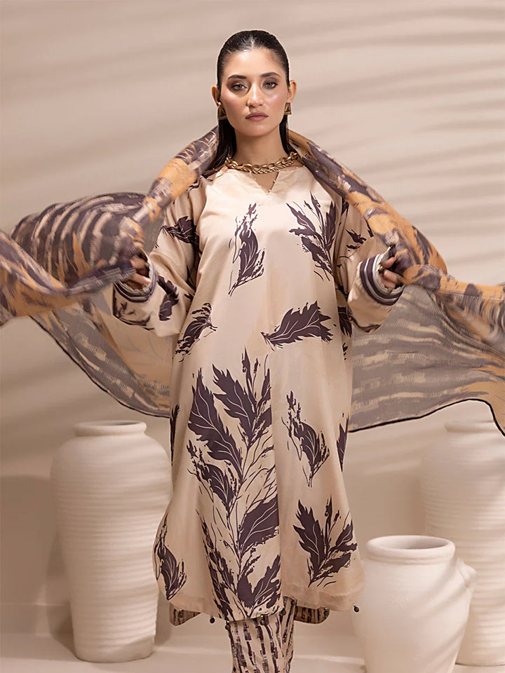 Elegant 3-piece suit in premium printed lawn silk. Includes a breathable shirt, trousers, and a lightweight dupatta. Perfect for any occasion.