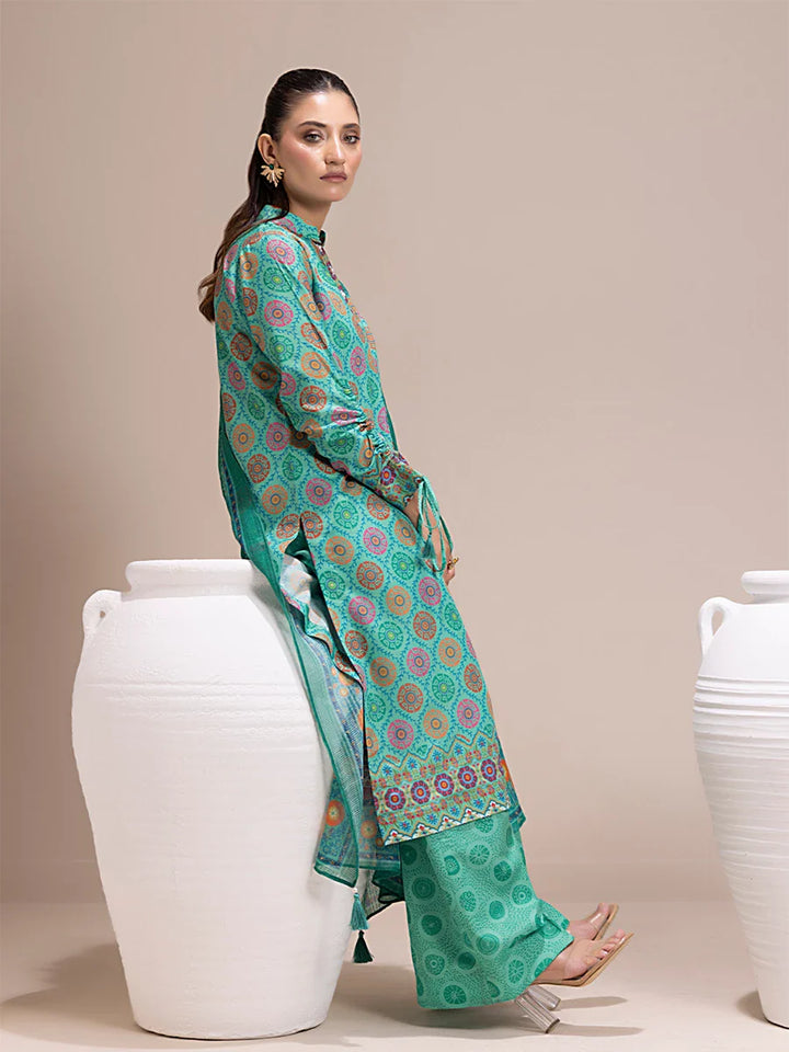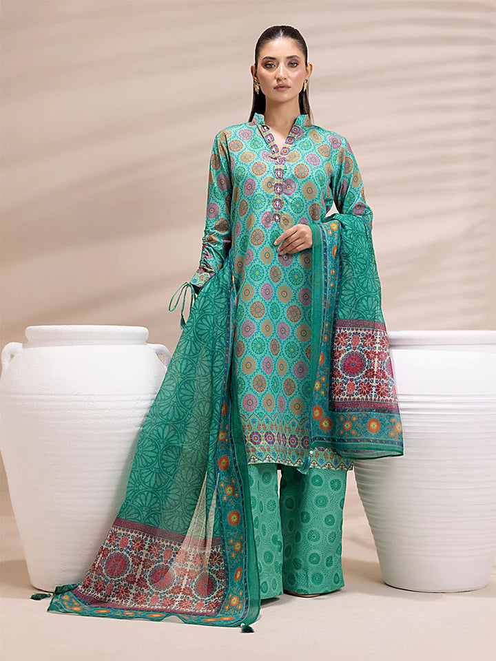 Elegant 3-piece suit in premium printed lawn silk. Includes a breathable shirt, trousers, and a lightweight dupatta. Perfect for any occasion.